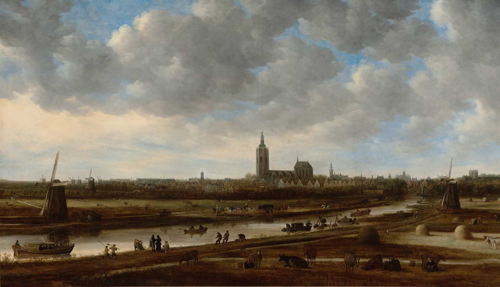 Voor het Gezicht op ’s-Gravenhage uit het zuidoosten heeft Van Goyen zich langs de Trekvliet geposteerd. Hij legde boerenland vast. En het leven van toen. Vrouwen die koeien melken. Boeren die aan het hooien zijn. Groepjes die uitrusten in de schaduw van een hooibaal. Een ooievaar is neergestreken. Aan het water kinderen met schepnetten. Palingvissers, wandelaars, ruiters. Koetsen met wel zes paarden ervoor, een teken dat de inzittenden hooggeplaatst waren. Een schuit op de Trekvliet, paard en ruiter op het jaagpad op de andere oever. Op die schuit zal hij later, als hij zijn schetsen in zijn atelier omzet in olieverf, zijn initialen zetten.