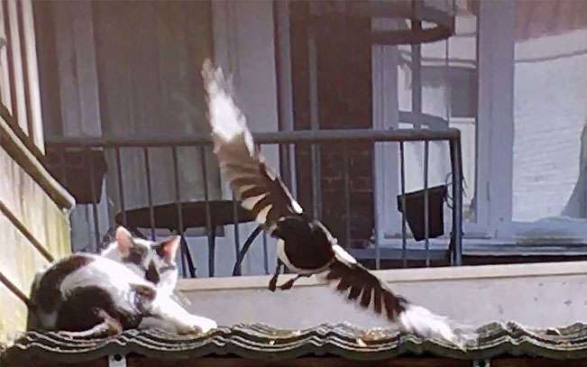 Het enige is dat dat dakje de favoriete plek is van mijn kat Micky. Toen de eksters het nest nog aan het bouwen waren, ruim twee weken geleden, maakten ze het Micky met zijn tweeën duidelijk dat hij niet welkom was. Ze vlogen om zijn kop, beslopen hem van achteren, zetten dit met geklepper kracht bij, hamerden intimiderend met hun snavels op de schutting en vlogen natuurlijk steeds op tijd weg als Micky geïrriteerd in beweging kwam. Nu het nest af is, doet meneer ekster dit werk in zijn eentje. Intussen duldt hij Micky ook niet meer in zijn eigen tuin.