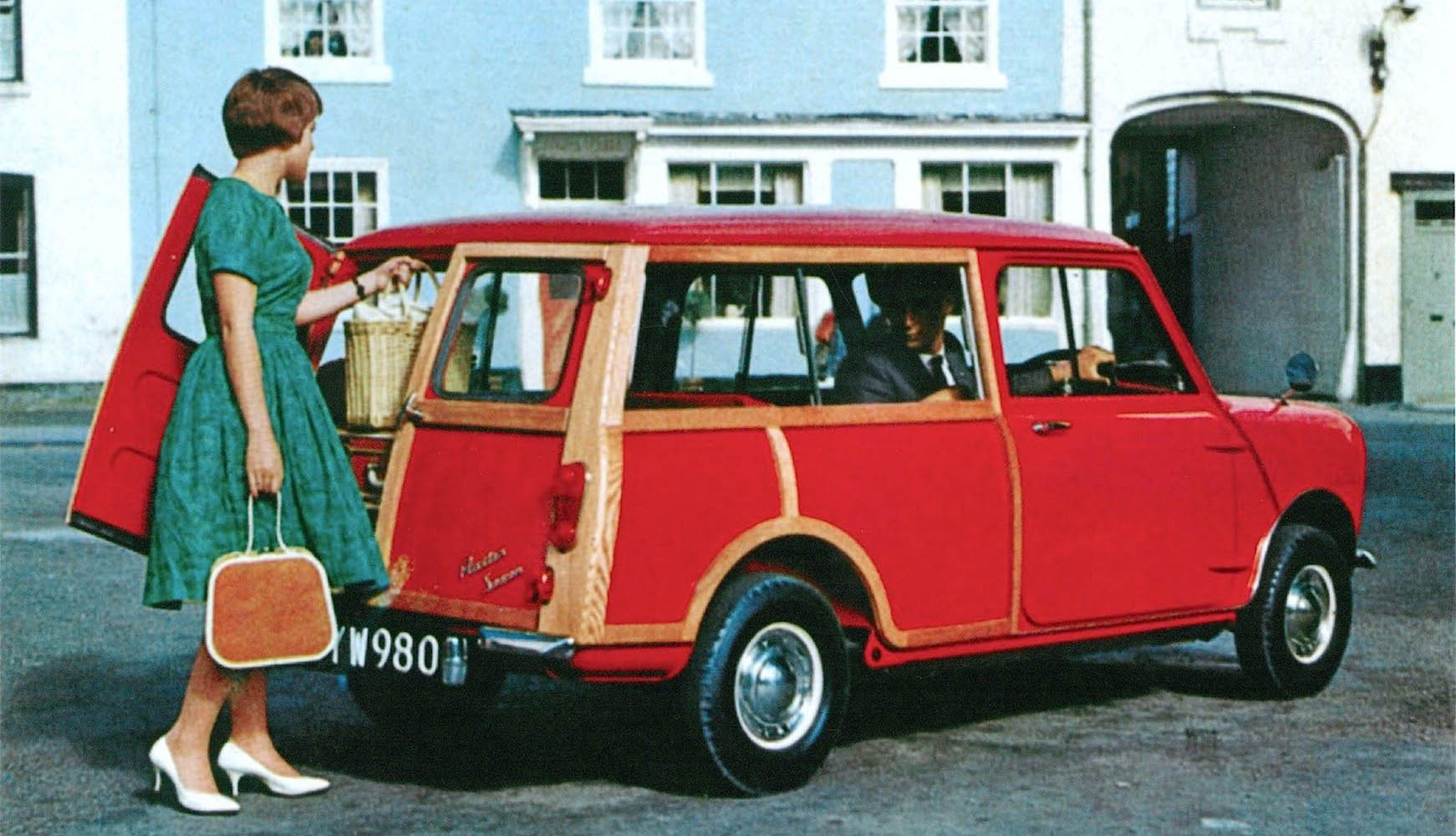 Ik herinner hem mij nog goed, want mijn tante Marjorie die met mijn oom Tinker in de badplaats Hove bij Brighton in Zuid-Engeland woonde, had zo’n lichtblauwe Morris Minor Traveller en had die ingeruild voor een nieuwe Austin Seven Countryman in dezelfde kleur. Tja, vrouwenlogica, maar dat terzijde. Als ze in Nederland kwamen, logeerden zij altijd in Hotel de Zalm in de Molenstraat, maar ook dat terzijde. De British Motor Company (BMC) waar zowel Austin als Morris toe behoorden, positioneerde deze Countryman als ‘de ideale combinatiewagen’. De kwaliteiten en de charme van een personenwagen in combinatie met de toepassingsmogelijkheden van een volbloed stationwagon. De Mini was nog geen jaar op de markt toen ze bij BMC deze variant bedachten. De Mini-basis werd iets verlengd en Alec Issigonis bedacht met zijn team een fraai vormgegeven stationwagon met een paar slimme stijlelementen en leende het houten frame-idee van de eerdere Morris Minor Traveller, wat weer geleend was van de befaamde Amerikaanse ‘Woodies’ aan de zij- en achterkant. Gemakshalve leende hij ook de ‘Barn style’ achterdeurtjes. Twee apart opzij scharnierende toegangsdeurtjes van zijn voorganger. Té leuk! Voor veel ondernemers en detaillisten was dit een ideale bedrijfsauto. Klein, wendbaar, vlot en het bood veel laadruimte en was ook nog leuk als gezinsauto. De bagageruimte was mooi vlak en vierkant en met de rugleuning van de achterbank plat kon je de bagageruimte bijna verdubbelen. Voor de rest had hij de charme van een gewone Mini. Dwars voorin geplaatste motor, waardoor er veel interieurruimte ontstond. Portierscharnieren aan de buitenkant, schuivende portierruitjes, grote bagagebakken, zowel voor- als achterin. De centraal geplaatste snelheidsmeter met links en rechts daarvan veel aflegruimte voor spulletjes die in de praktijk altijd van rechts naar links slingerden, maar de gedachte was goed. Of je nu lang of kort was, de stoeltjes hadden ook maar één stand en de leuningen waren evenmin verstelbaar. Je kon ze alleen maar naar voren klappen om achterin plaats te nemen.