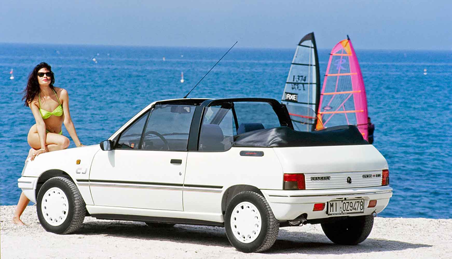 In die jaren moesten cabrio’s voldoen aan de Amerikaanse veiligheidseisen. Daarom werd er een verstevigingsbeugel in het midden geplaatst, waardoor de auto op een eiermandje leek, maar Pininfarina maakte er bij deze Peugeot toch iets fraais van met een specifieke lijn. Oplopende motorkap, vloeiend overgaand in de gelaagde voorruit, brede stootstrips en natuurlijk de markante cabrio-kap. Deze 205 cabrio was leverbaar in twee uitvoeringen. De 205 CJ en de CTi. De eerste had een 1124 cc benzinemotor met 60 pk en een topsnelheid van 160 kilometer en de CTi een krachtige 1905 cc motor met 105 pk en een topsnelheid van 185 kilometer. Beide uitvoeringen hadden een vijf-versnellingsbak. Afgezien van de verschillende motoren was de CTi luxer uitgevoerd, met onder andere stuurbekrachtiging en geventileerde remschijven vóór. Digitaalklokje, halogeen verstralers, ruitenwissers met intervalschakelaar, lichtmetalen velgen, centrale portier, kofferbakvergrendeling en speciale kuipstoelen, om maar eens wat te noemen. Speels waren bij de CTi ook de rode bies rondom de auto in de bumpers en de stootranden aan de zijkant, wat ook weer terugkwam in het interieur en de portieren. De bekleding was zwarte stof met in het midden een rood-zwarte stip en de vloerbedekking was, u raadt het al, ook rood. Opvallend maar toch beschaafd. Peugeot communiceerde dat zij het interieur hadden afgestemd op een sportieve rijstijl. Zo was er een elektronische toerenteller, een koelvloeistof-temperatuurmeter, een oliedrukmeter, een olietemperatuurmeter, maar ook verklikkerlampjes voor het koelwaterstofniveau in de radiator, het minimum-brandstofniveau en voor de slijtage van de remblokken vóór. Er waren ook tiptoetsen voor de elektrisch bedienbare portierruiten en de elektrisch te openen en te sluiten cabrio-kap. Bijzonder voor die tijd was de herinneringsstand van de voorstoelen, waardoor ze terugvielen in de ingestelde stand, nadat de achterpassagiers waren ingestapt. Interessant was het verwarmingssysteem, waarbij de verwarming naar de voeten tien graden hoger was dan de temperatuur uit de frontventilatierooster. De zit achter het sportieve stuur was prima. Ik moet zeggen dat de kleur rood wel erg heftig was doorgevoerd, want in de naaf van het stuur stond ook prominent CTi en ook in de versnellingspookknop was het schakelpatroon in het rood aangegeven. Desondanks een mooi vormgegeven dashboard. Net als de standaard 205 had ook deze CTi een plezierig rijgedrag, met name door zijn voorwielaandrijving. De vering had voor mij wel wat straffer gemogen voor het sportieve karakter, maar dit was typisch Frans comfortabel. In het verkeer was hij vlot handelbaar en fel accelererend, hoewel ik het schakelpatroon wel wat vaag vond en het liever wat strakker had gehad, maar ook dat was typisch Frans. Heel modern voor die tijd was de in twee delen neerklapbare achterbank. Al met al een superleuke cabrio.