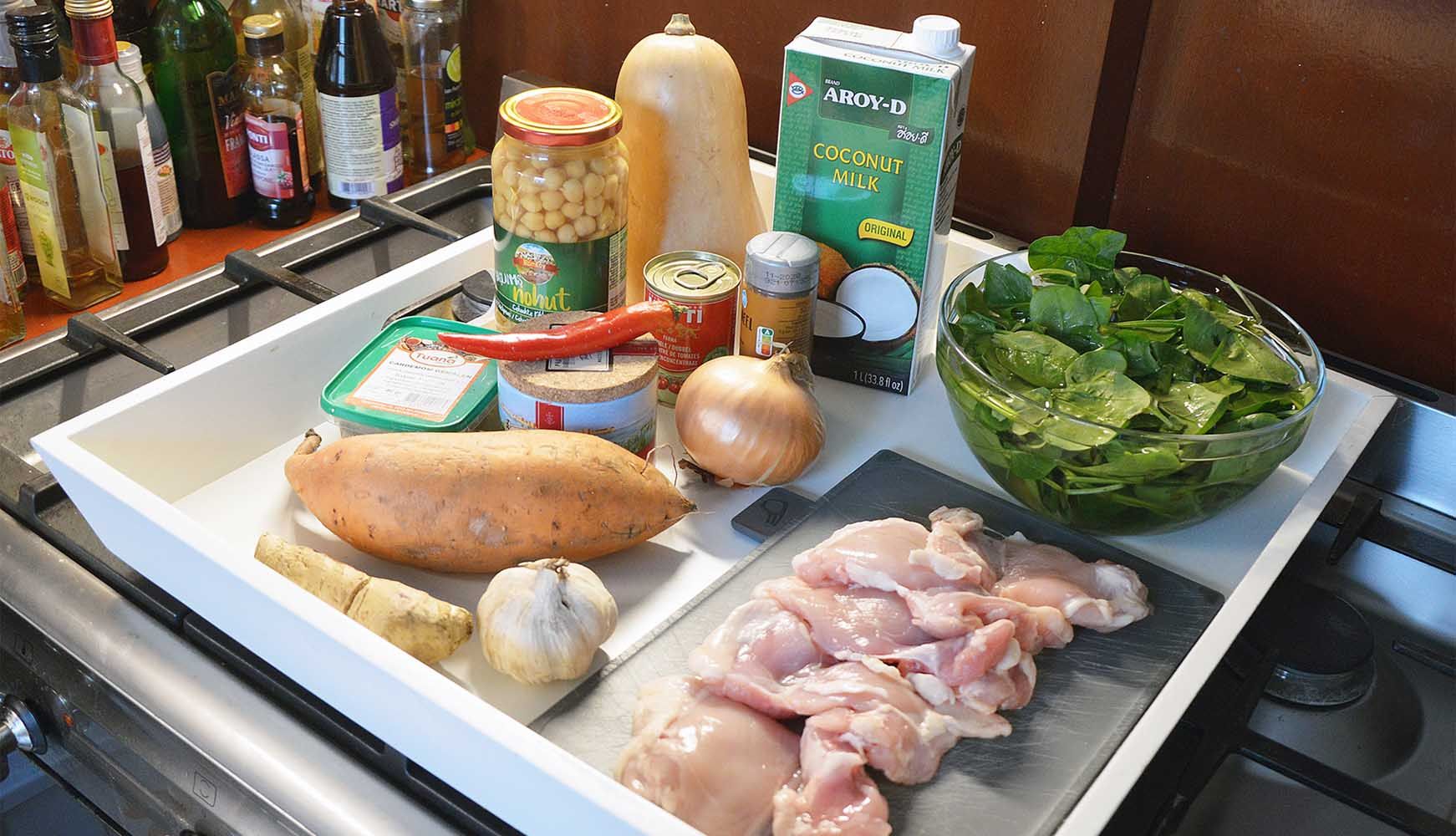 • Voeg de rest van de kokosmelk toe en laat pruttelen totdat de pompoen en aard-appel zacht beginnen