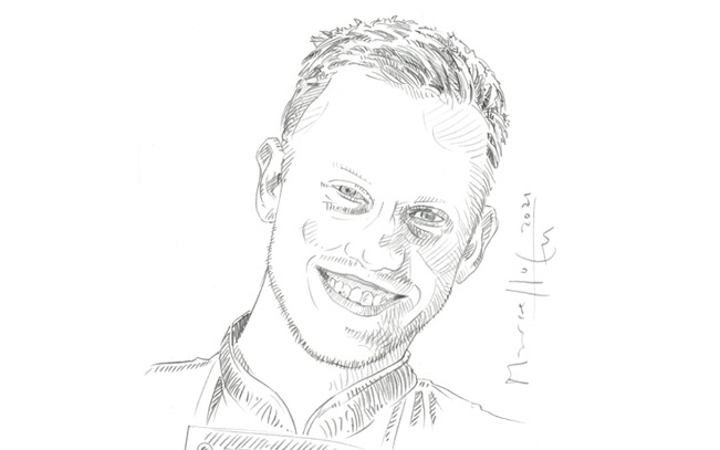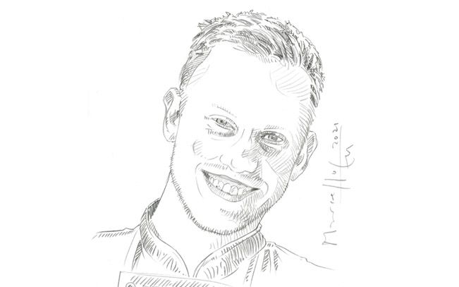 Rond zes uur (precies op tijd!) stond de fietskoerier met onze bestelling voor de deur en kon het feest beginnen. Negen verschillende sushi’s en twee salades. Mooie smakelijke sushi’s met krab, groentes, viseitjes en garnaal. Het zag er fantastisch uit. Als extra’s: de bekende plastic visjes met sojasaus, dun gesneden gember en natuurlijk wasabi. Na de eerste hap was Marcello’s twijfel compleet weg: “Hee Els, moet je deze eens proeven en kijk dan wat hier in zit. Proef, lekker!” Eerlijk is eerlijk, we hebben in tijden niet zo lekker gegeten. En, o ja, eet de sushi’s met mango als laatste, als dessert. Onze complimenten voor chef Kevin John (tekening).