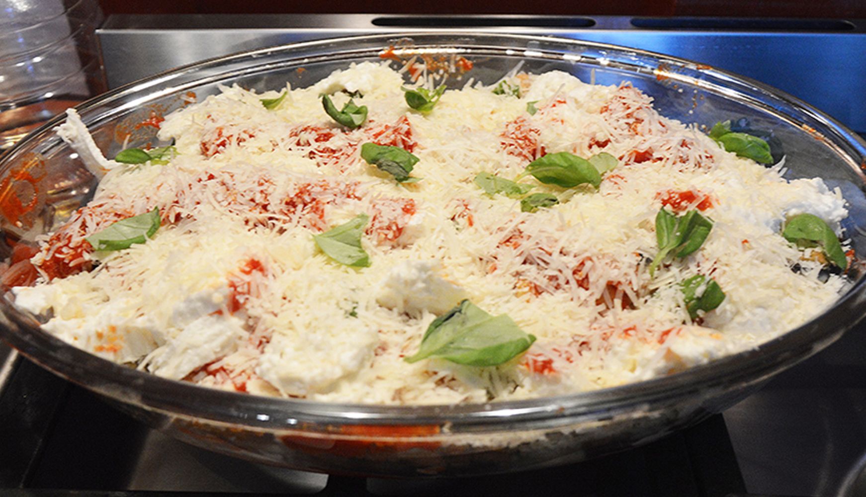 Verhit de oven op 180 graden en neem een diepe ovenschaal. Leg nu eerst wat saus op de bodem. Daarop een laag aubergine. Daarop weer een dunne laag saus met blokjes mozzarella, een paar blaadjes basilicum en geraspte Parmezaan. Herhaal dit tot alles op is en sluit af met een bovenste laag van Parmezaan.