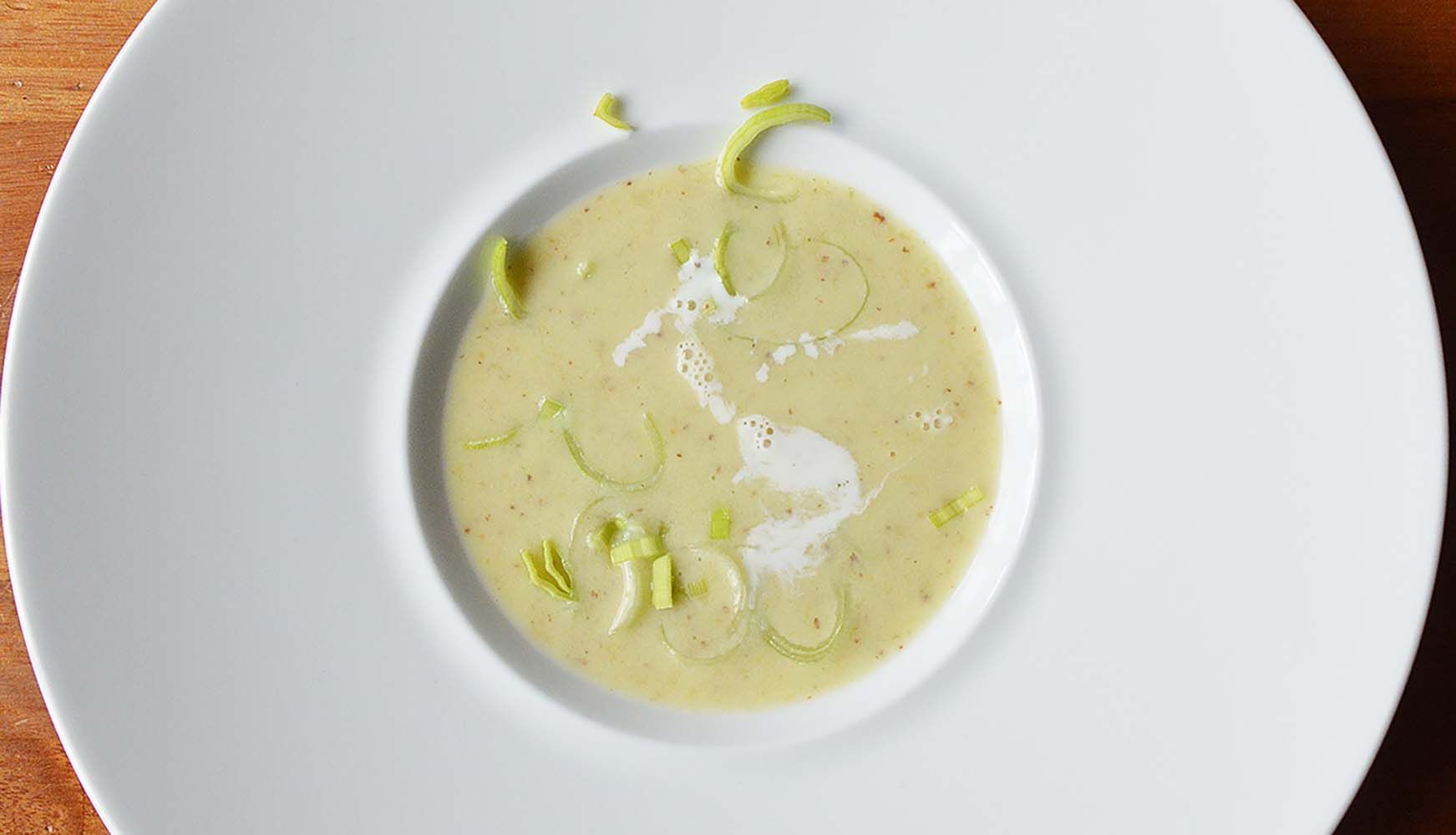 Pureer als de aardappels gaar zijn alles fijn met een staafmixer. Giet de room erbij en roer nogmaals goed door. Proef of de soep goed op smaak is en er misschien nog een snufje peper, zout of een beetje mosterd mist. Garneer de soep met een klein scheutje room en wat groene ringetjes prei. Eet smakelijk!