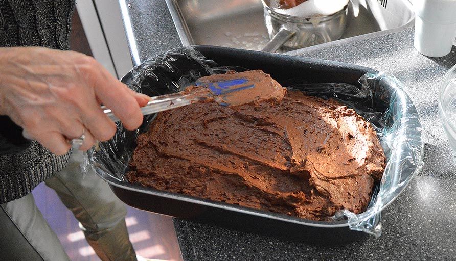 - Giet vervolgens het mengsel in een met plastic folie bedekte bakvorm en zet het minimaal 4 uur in de vriezer.