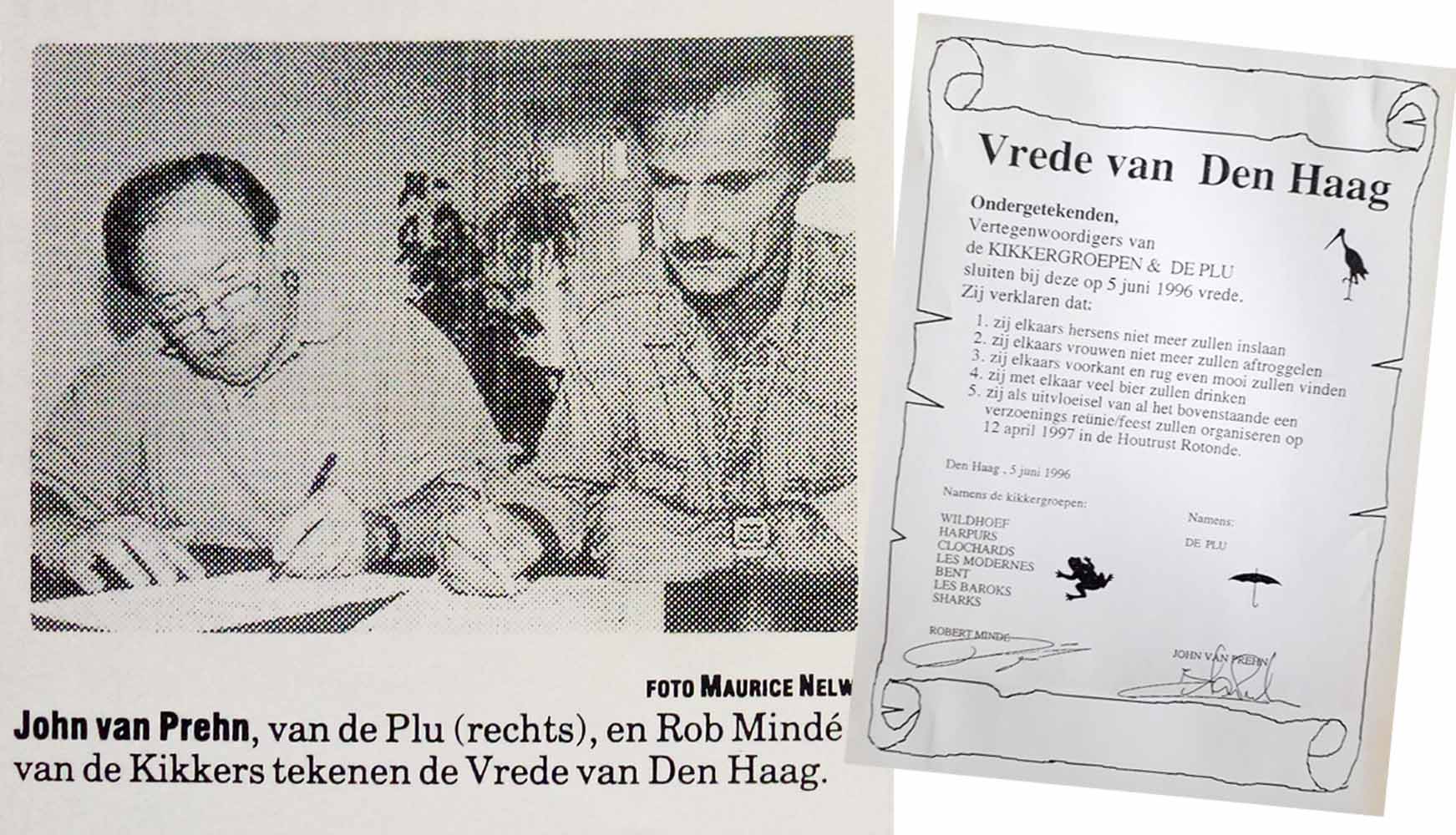 Op 12 april 1997 vond in de voormalige Houtrust Rotonde de grote verzoening plaats tussen de Kikkers en de Plu, de twee grootste Haagse jeugdbendes uit de jaren zestig van de vorige eeuw. Ruim vijfhonderd gegoede vijftigers gaven acte de présence. Het was een van de punten uit ‘De Vrede van Den Haag’ van 5 juni 1996. Deze vrede werd na ruim dertig jaar alsnog gesloten tussen de aartsvijanden van weleer John van Prehn, namens de Plu, en ondergetekende, namens de gezamenlijke Kikker groepen. Muziek werd verzorgd door The Crazy Rockers voor de Plu en The Scarlets voor de Kikkers. Deze Vrede kwam zelfs voor in de Grote Geschiedenis Quiz op tv.