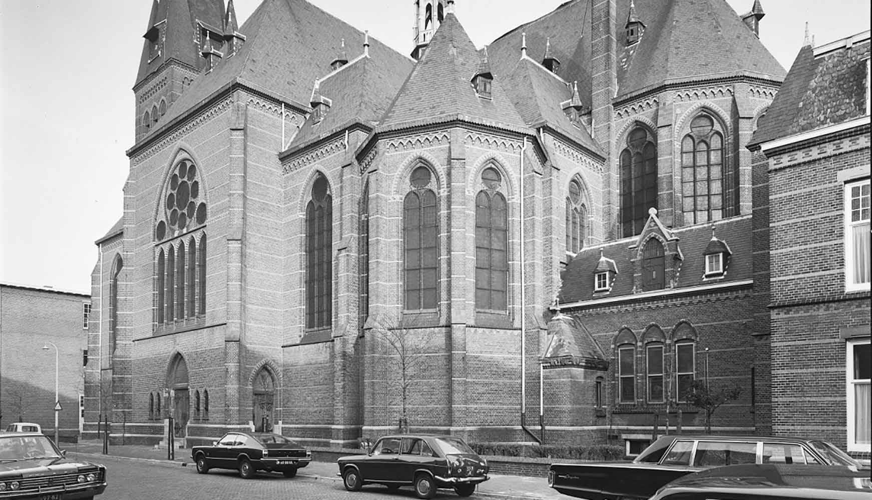 De Engelbewaarderskerk aan de Brandtstraatkant, met sacristie en deel van de pastorie. Foto uit 1972, archief van de Rijksdienst voor het Cultureel Erfgoed -