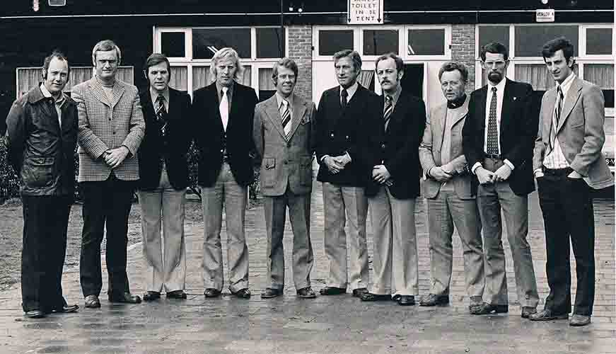 Ca. 1975 met de oude kantine en het bestuur van de voetbalverenging SV’35 uit die tijd. Geheel rechts ben ik (handen in de zak) -