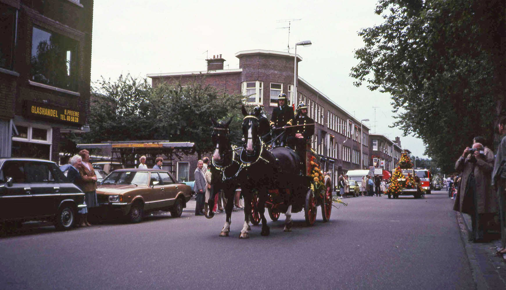 Zuiderparklaan hoek Nijkerklaan, optocht met wagens van de brandweer. Foto uit 1975, Henny van Maarschalkerweerd, collectie HGA -