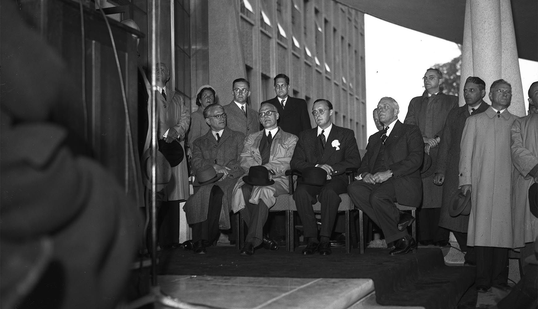Genodigden bij de ingebruikneming van het hoofdkantoor van de KLM aan de Plesmanweg. In het midden prins Bernhard, rechts naast hem Dr. A. Plesman. Foto uit 1949, Fotopersbureau van den Heuvel, Haags Gemeentearchief -