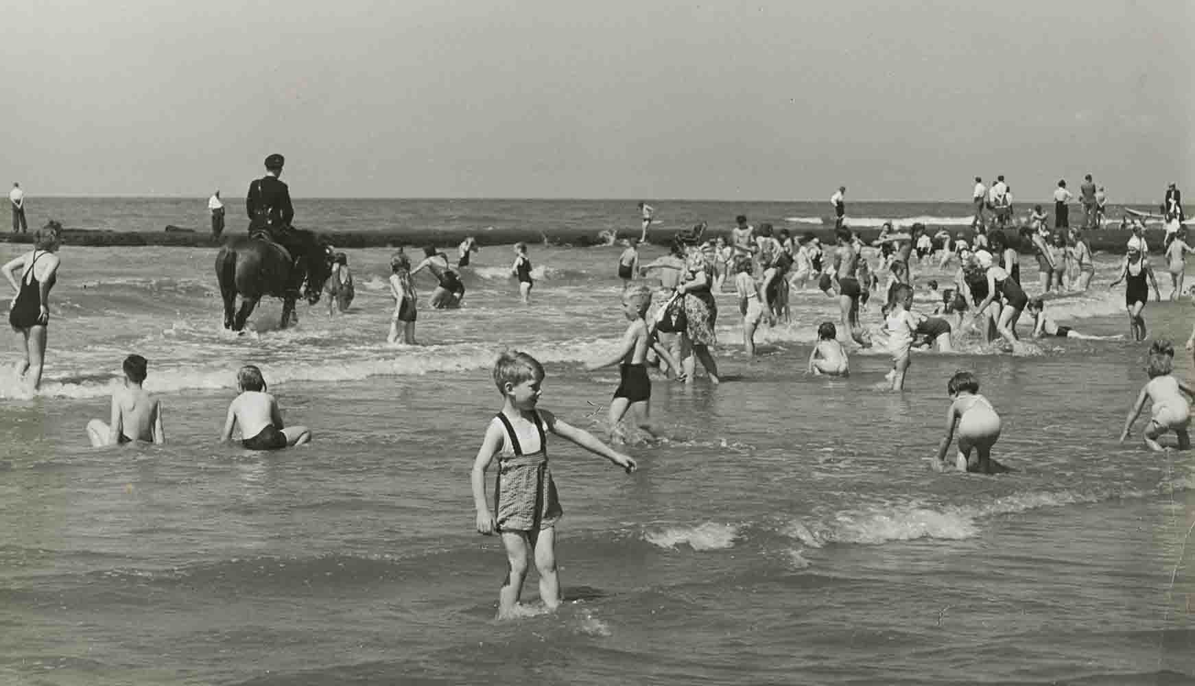 Strandagent te paard patrouilleert in de branding. Foto uit 1949, JosPé, Haags Gemeentearchief -