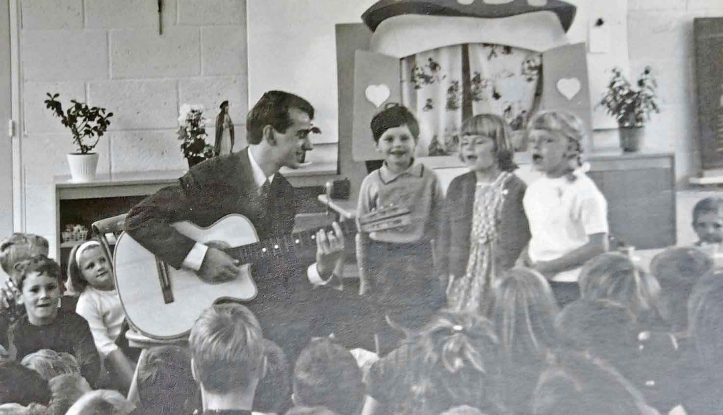 Niet alleen de zangkunst maakte ik me in mijn jeugd meester. Dankzij mijn ouders werden mijn oudste zus en ik verrast met onze verjaardagen. We kregen één gitaar voor ons beiden. Op de Kardinaal de Jongschool werd een onderwijzer gevonden die ons met plezier het snaarinstrument niet onder de knie, maar op de knie, wilde krijgen. Hij heette de heer Middendorp en was een musicus pur sang. Niet alleen gitaarleraar, maar ook bandleider van de schoolband van de Dr. Ariens Mulo, waarin ik vrij snel een plaatsje veroverde. Wekelijks werd er gerepeteerd en onder zijn leiding werd een repertoire opgebouwd dat ons in die dagen door orkesten met naam en faam werd voorgespeeld. Als saxofonist was de heer Middendorp een waar bandleider. De fraters en de school bezoekende jeugd waren op nog spaarzame schoolavonden hoorbaar onder de indruk. Zelfs de meisjes van boven deden een muzikale duit in het zakje. Zij zongen, door ons begeleid, het toen bekende lied Peter, is mijn ideaal, op de radio uitgevoerd en bekend geworden door het meisjeskoor Sweet Sixteen.