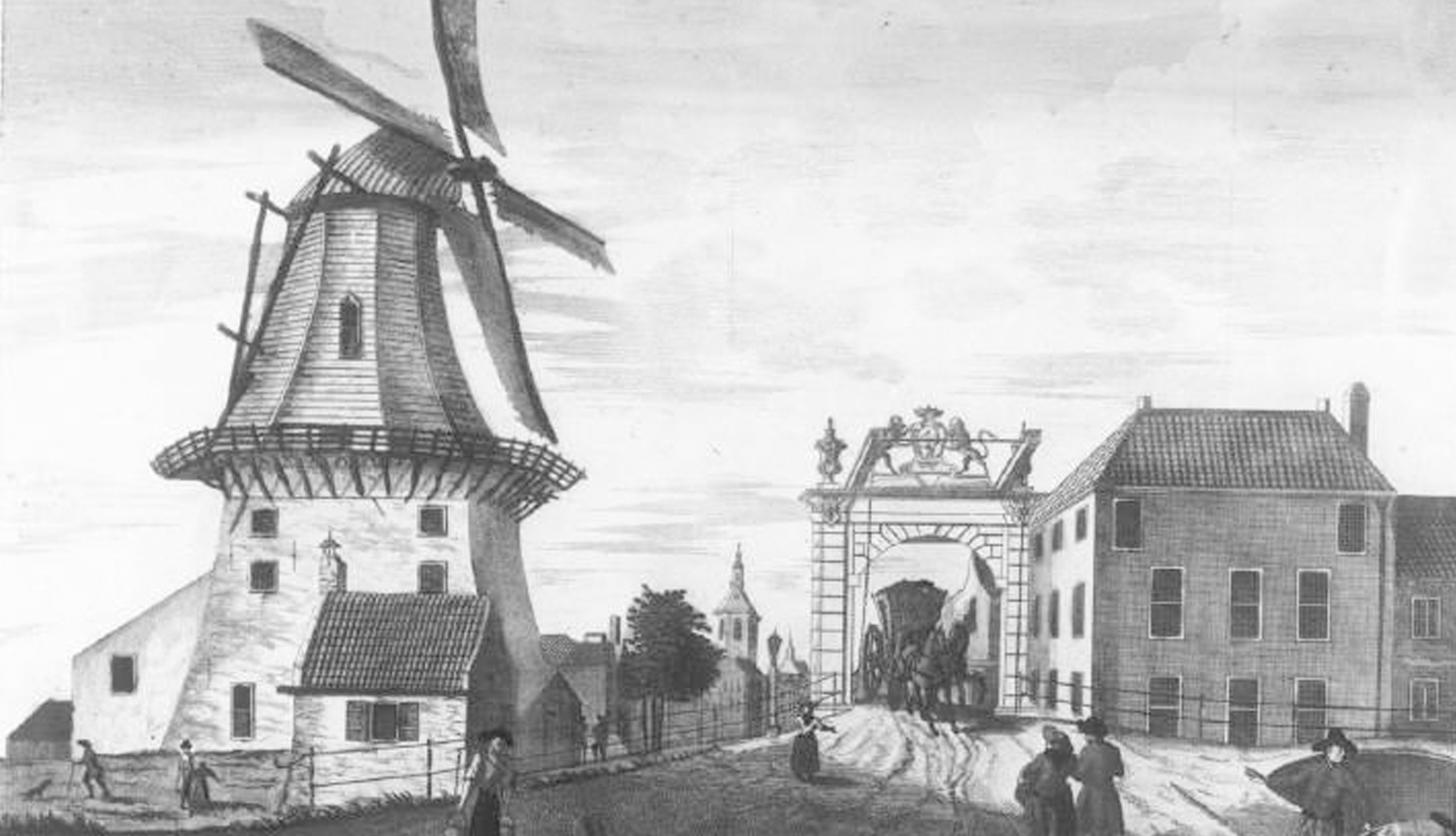 Gezicht naar de Loosduinse brug met links een molen, 1770. Vervaardiger F. Wit. Collectie Haags Gemeentearchief. -