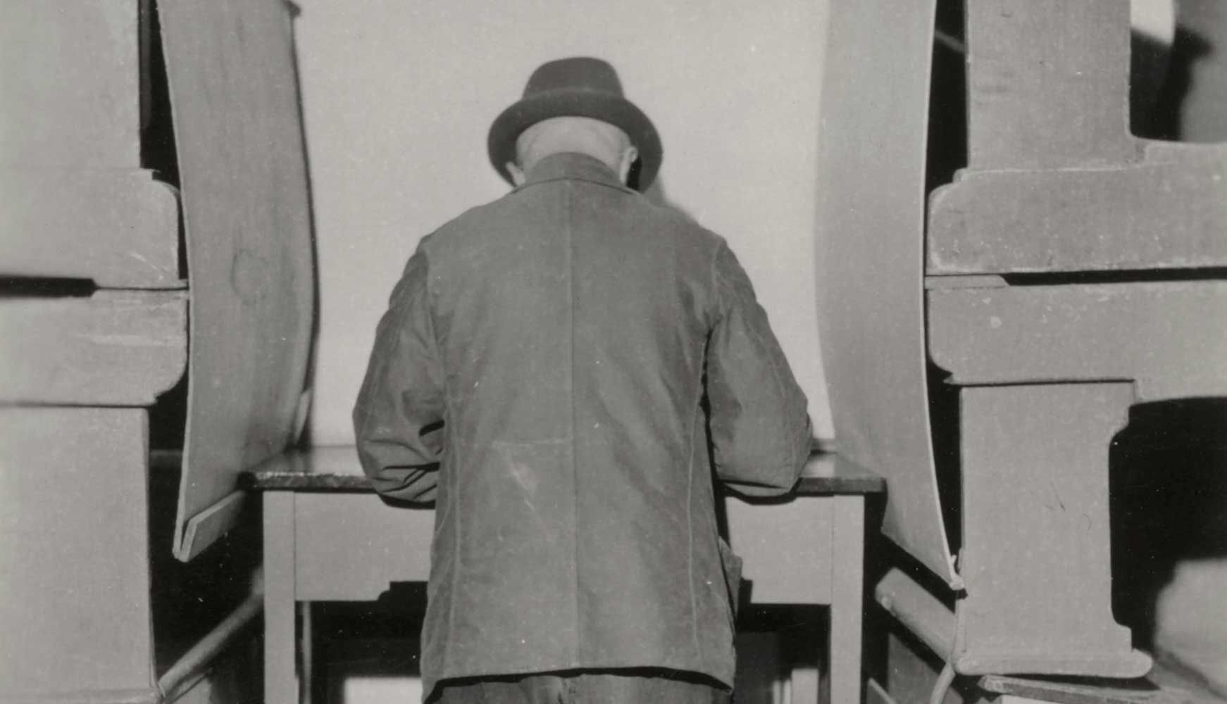 Verkiezingen, stemhokje met kiezer in een stemlokaal, 1946. Foto: collectie HGA -