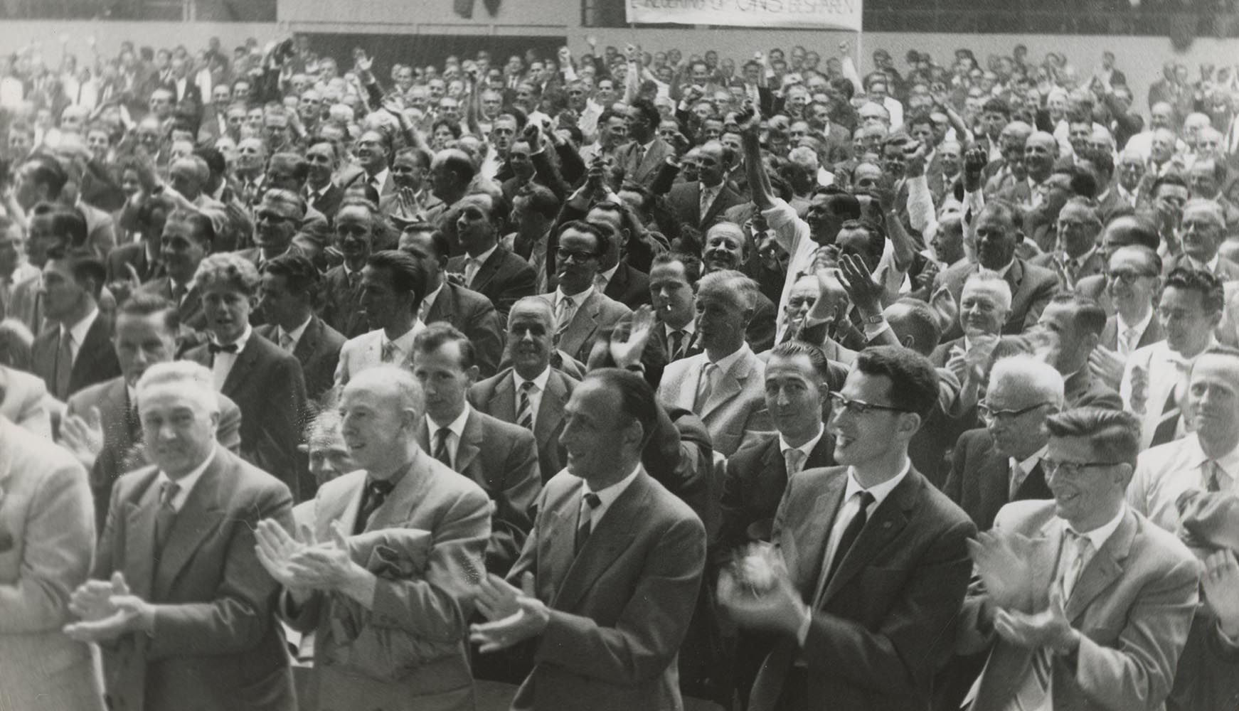 Belastingambtenaren, aangesloten bij de Nederlands Christelijke Bond van Overheidspersoneel, de A.B.V.A. en de A.R.K.A., houden in 1961 een massale protestvergadering in de Houtrusthallen tegen het promotie- en salarisbeleid. Na de rede van J.J. Loerakker, secretaris van de ARKA, die scherpe kritiek leverde op de houding van de regering, applaudisseren de ongeveer 6.000 aanwezigen luid.