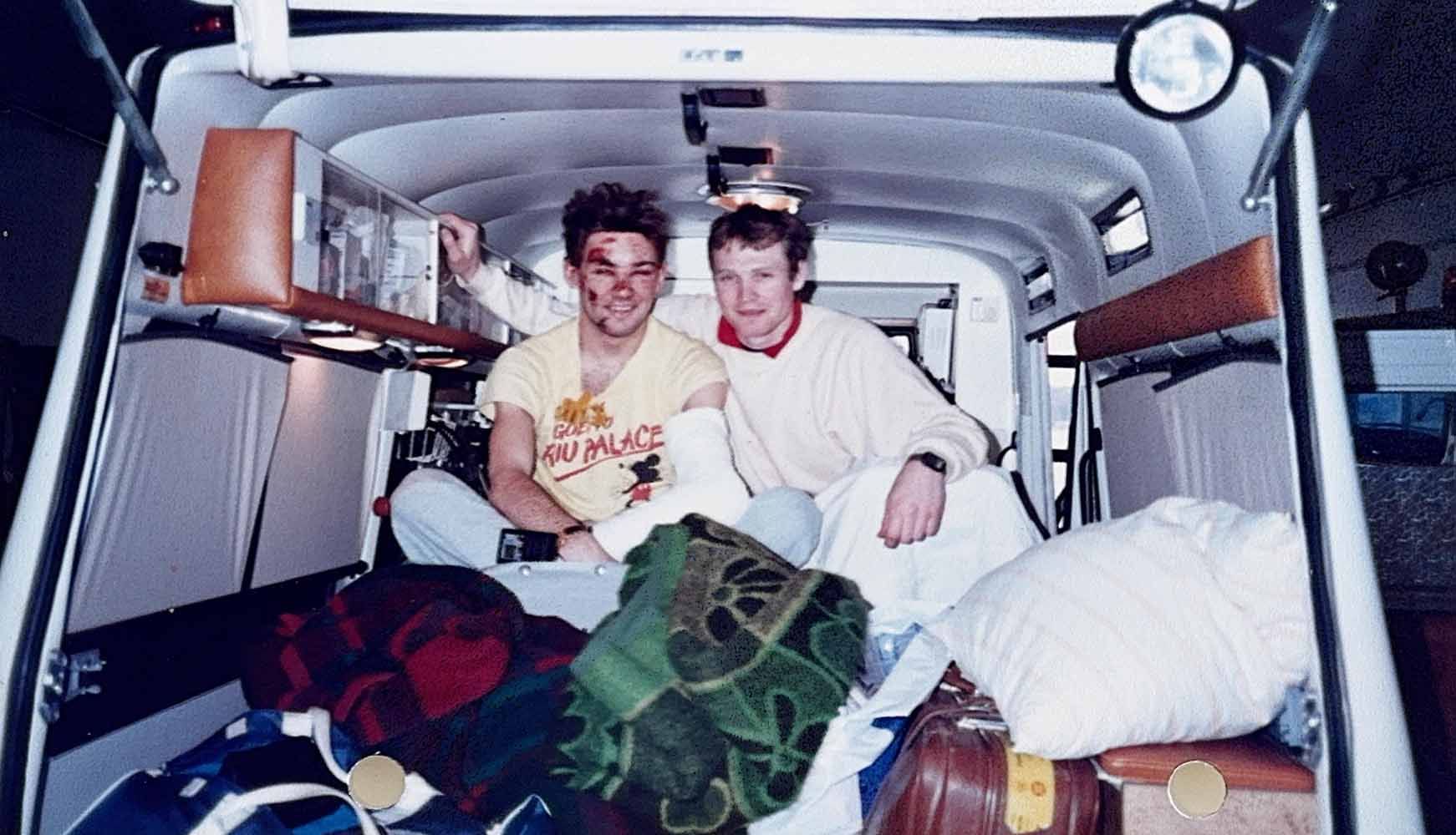 In de ambulance. Links Aad - met arm in het gips - en rechts Nick. -