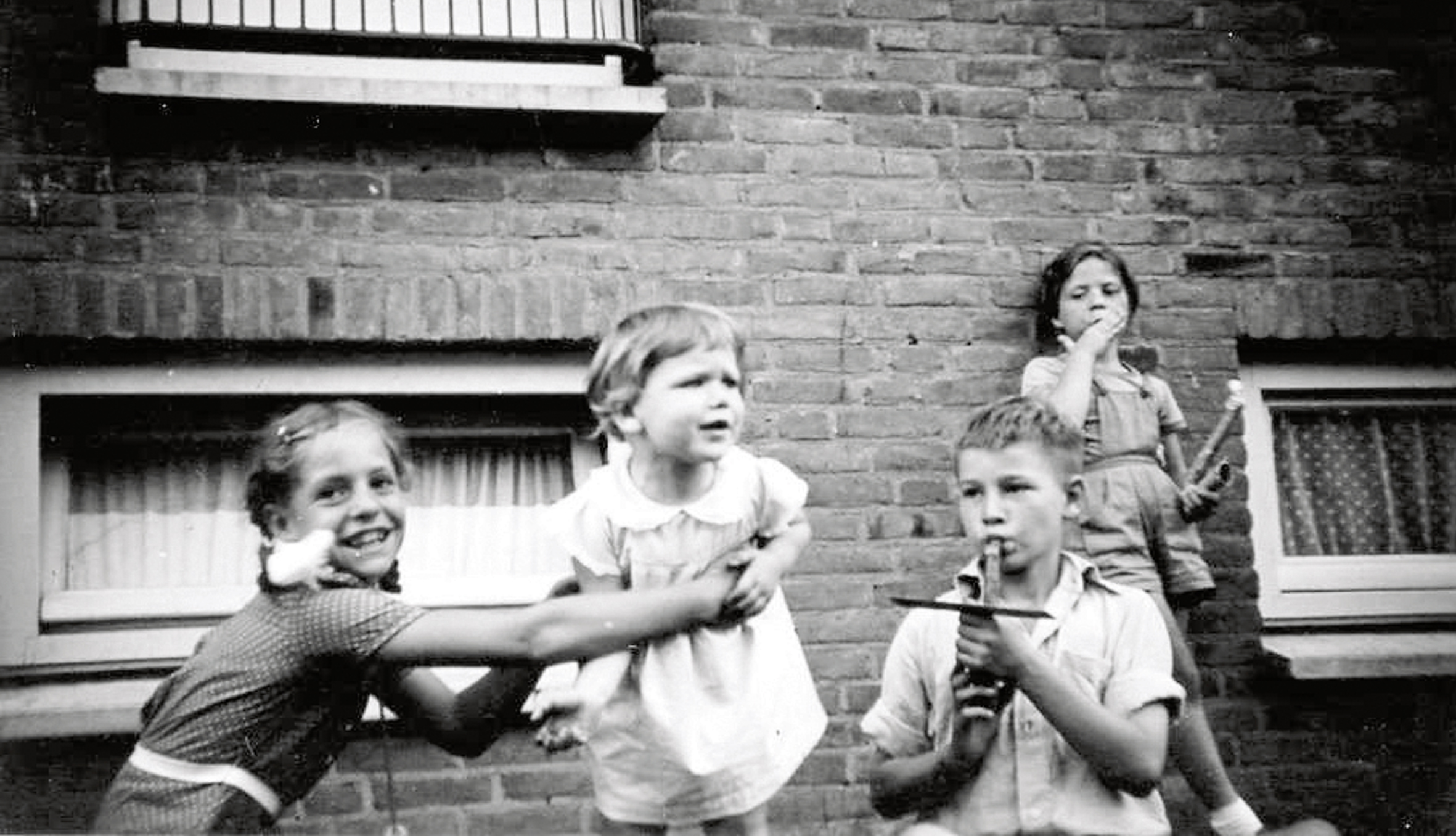 Onze voortuin bestond gedeeltelijk uit struiken, daar kon je weinig mee. Aan de andere kant van het pad naar de portiekdeur lag gras. ‘s Zomers was dat geknipt om tenten te bouwen. Ieder van ons moest dan spullen meenemen: touwen, kleden, knijpers. De touwen werden vastgemaakt aan het ‘balkonnetje’ van de bel-etage. Maar hoeveel, hoe strak en hoe steil - daarover werd fel gediscussieerd. Dat gebeurde ook zo met de kleden: welke gebruikte je om op te zitten? En moesten de zijkanten wel of niet gesloten worden? Iedereen wist het zelf beter en herstelde wat de anderen ‘fout’ gedaan hadden. Pas na flink wat gekibbel was de tent goed genoeg om er met z’n allen in te gaan zitten. Wat weer problemen gaf, want wie mocht waar zitten? Als ook dát opgelost was, tja, wat moet je dan eigenlijk doen in een tent? Het was leuker om gewoon op straat te spelen. Tikkertje, tollen, hinkelen, knikkeren, touwtjespringen…