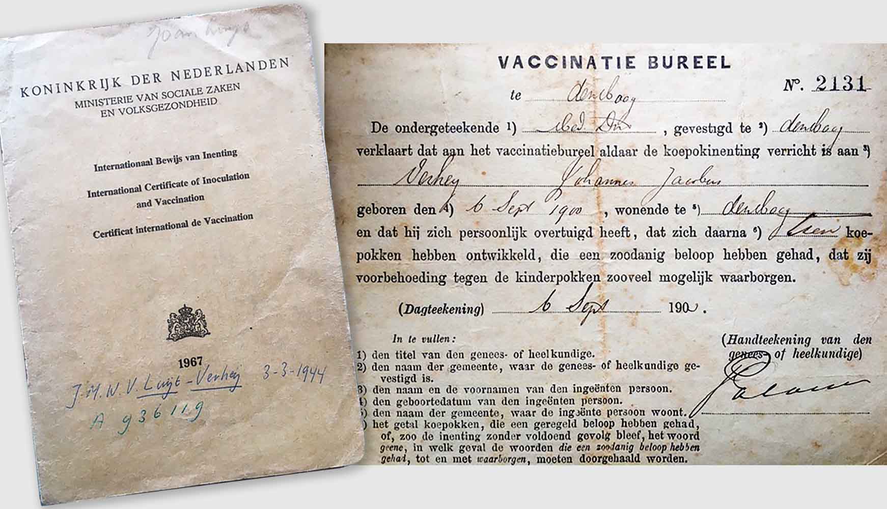 Bij het opruimen van familiespullen vond ik enige maanden geleden het zogeheten ‘pokkenbriefje’ van mijn vader in het trouwboekje van mijn ouders, Johannes Jacobus Verheij en Jantje Maria Stahlecker, die in het huwelijk traden in 1928 in het oude stadhuis aan de Groenmarkt. In het trouwboekje zat een envelopje met daarop ‘Openbaar Onderwijs te ’s-Gravenhage’ en in keurig handschrift J.J. Verheij. In dat envelopje zat een verkleurd briefje van het ‘Vaccinatie Bureel’, met een verklaring dat “de genees- of heelkundige zich persoonlijk had overtuigd dat aan het vaccinatiebureel aldaar de koepokinenting was verricht aan Verheij Johannes Jacobus, geboren den 6e Sept. 1900 en dat hij zich persoonlijk ervan overtuigd had dat daarna tien koepokken zich had ontwikkeld die een zoodanig beloop hadden gehad dat zij voorbehoeding tegen de kinderpokken zooveel mogelijk waarborgen”, getekend 6 september 1903. Hij moest kennelijk terugkomen voor controle of de pokken waren opgekomen op zijn derde verjaardag. Op de achterzijde nog data, met handtekeningen van herhalingen op 2-4-’07 en 15-7-’15. Al die jaren bewaard, want het was een belangrijk document.
