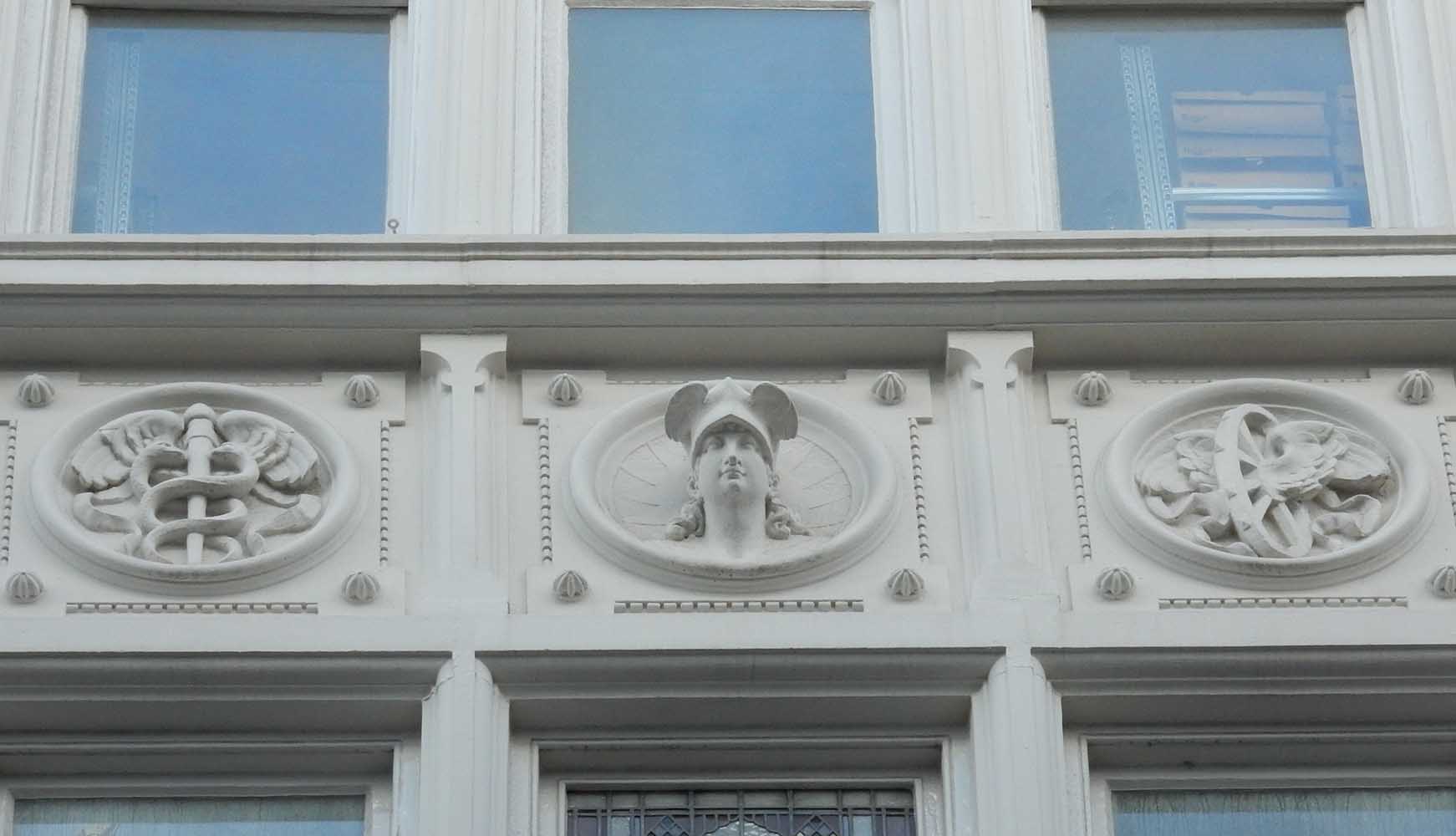 In de gevel van Venestraat 15 zijn zelfs drie Mercuriussymbolen te vinden: staf, kop van de god en een gevleugeld wiel. Ze verwijzen ongetwijfeld naar de eerste gebruikers van het pand, alleen is niet meer bekend wat voor bedrijf dat was. De symbolen van Mercurius doen het ook erg mooi in een tegeltableau. Zoals te zien is aan het prachtige Art Nouveau pand op de hoek van de Laan van Meerdervoort - Waldeck Pyrmontkade.