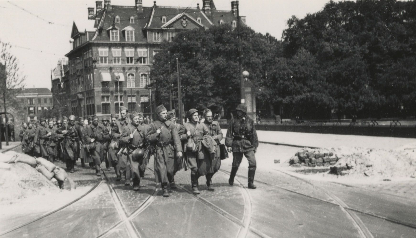 Duitse militairen lopen over het Buitenhof, waar een versperring met smalle doorgang is gemaakt. mei 1940. Foto: A. E. Ament, collectie HGA -