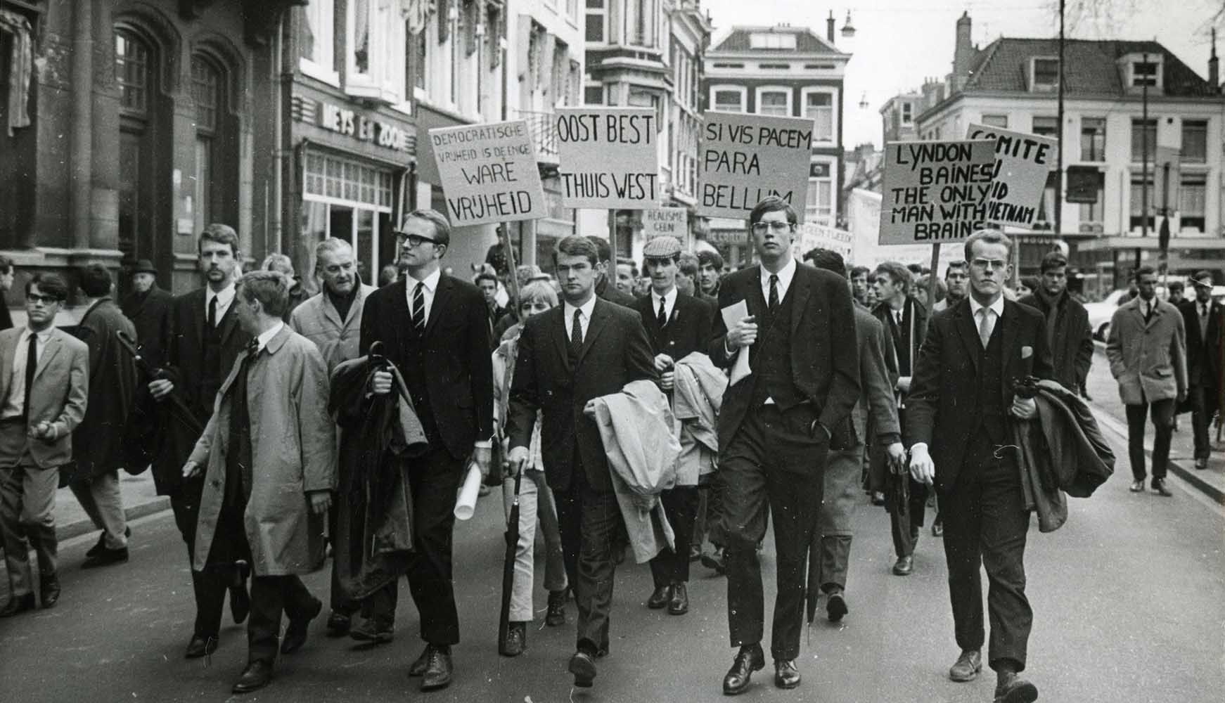 Deelnemers aan een demonstratie voor de Amerikaanse politiek in Vietnam. Foto uit 1967, Stokvis, Haags Gemeentearchief -