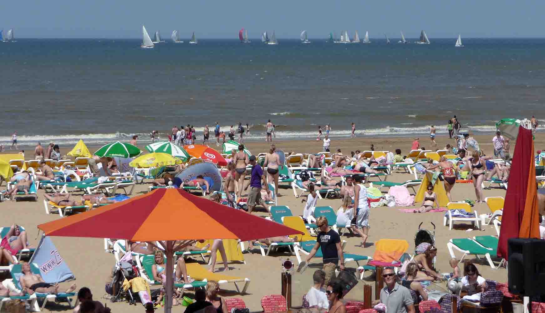 Drukke zomerse dag aan het Scheveningse strand. Foto: Paul Lunenburg, Dienst Stedelijke Ontwikkeling, Haags Gemeentearchief -
