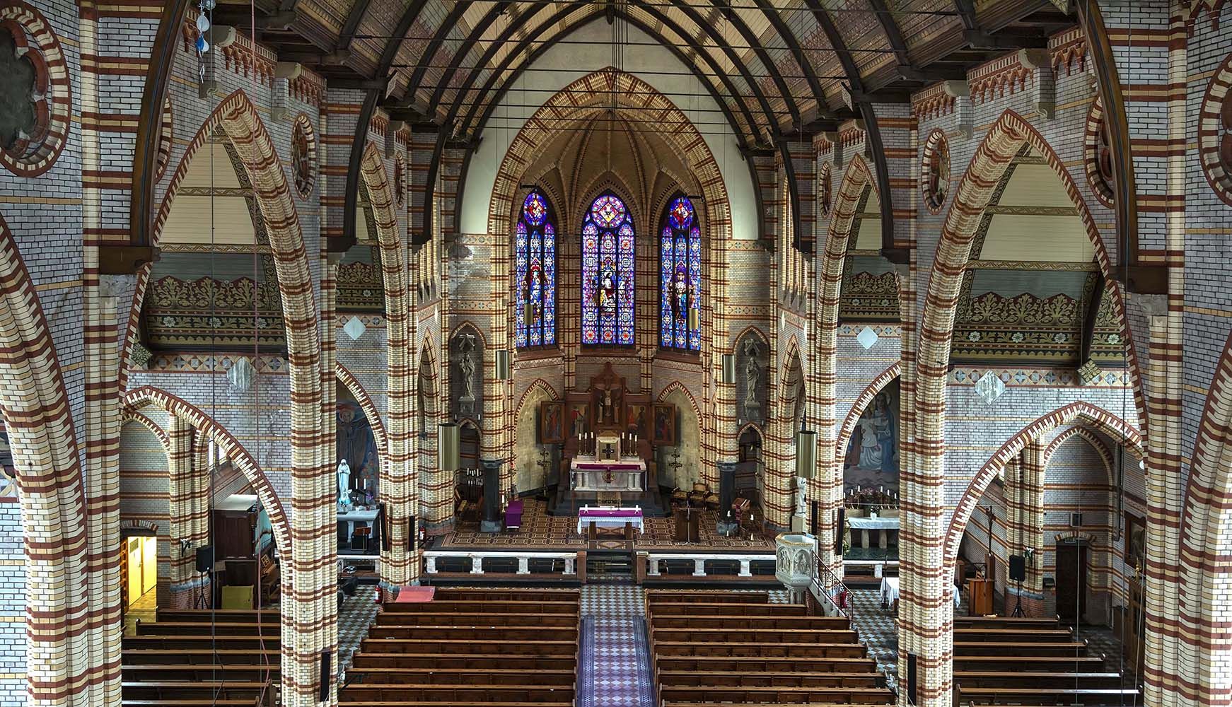 De vijftien jaar tussen het eerste en het tweede deel van de kerk is aan de buitenkant duidelijk te zien. De voorgevel en de toren zijn duidelijk uit een nieuwere tijd. Zij hebben niet het rijzige en elegante silhouet dat zo kenmerkend is voor de neogotische kerken maar zijn sober en robuust, passend bij de architectuur van het interbellum. Ook de pastorie in de Stortenbekerstraat werd afgebouwd en aanzienlijk vergroot tot de huidige omvang. Wat onmiddellijk in het interieur opvalt, is de nadrukkelijke aanwezigheid van de talloze bakstenen in witte, zachtgele, blauwe en bruinrode kleuren. Dat maakt het ten opzichte van de andere neogotische kerken heel bijzonder. Molenaar heeft de muren en de pijlers van de scheibogen niet laten bedekken met pleisterwerk, maar gekozen voor de modieuze verblendsteen. Dat is een gladde, zacht glanzende baksteen die rond 1900 vooral in de vernieuwende art nouveau of Jugendstil werd toegepast.