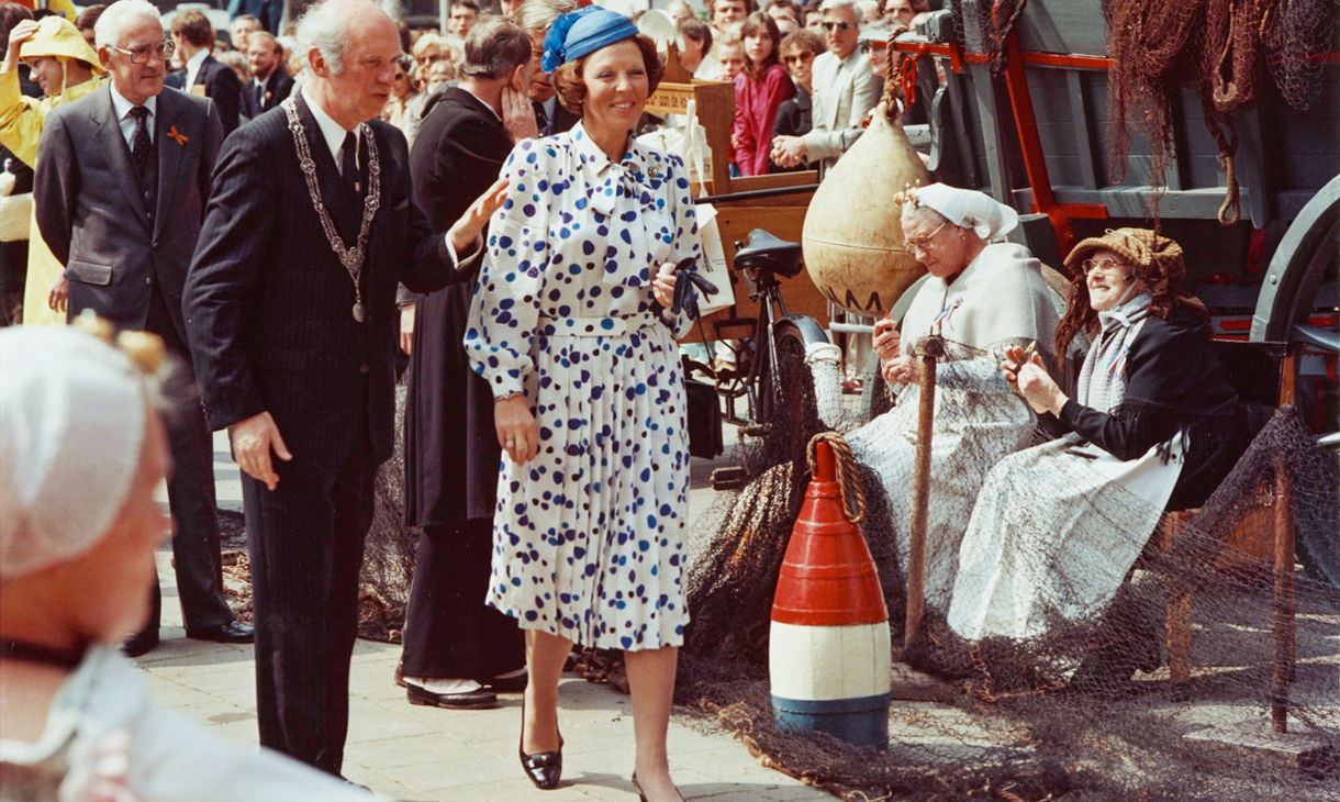 De koninklijke familie viert Koninginnedag 1984 in Den Haag. Burgemeester Schols en koningin Beatrix bij Scheveningse vrouwen die het nettenboeten demonstreren op het Kerkplein, 1984. Foto: Fotoburo Thuring, collectie Haags Gemeentearchief -