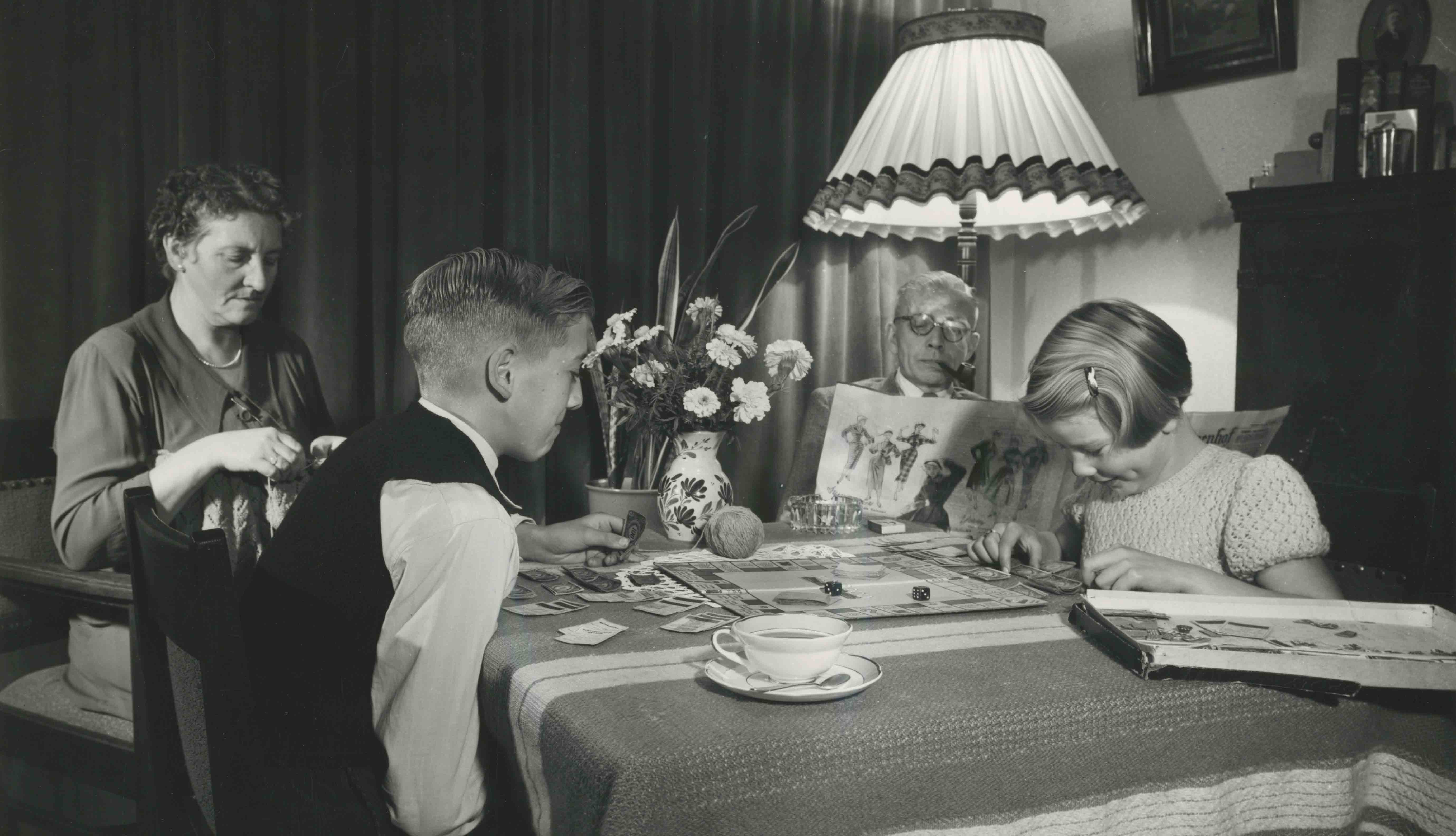 De woonkamer was in alle opzichten eenvoudig, zo niet erg eenvoudig. Bankstellen bestonden nog niet, zeker niet in ons milieu. Er was alleen een eettafel met zes stoelen, waarboven een lamp hing. Daar las mijn vader altijd de krant en dan was er voor anderen geen of nauwelijks plaats, want die krant kende nog een groot formaat. De tafel werd natuurlijk ook voor het avondeten gebruikt en als ‘speeltafel’ wanneer mijn ouders het wel opportuun vonden om met het gezin een spelletje te spelen. Tv kijken deden we nog niet, want die hadden we simpelweg niet. Ook hadden we geen heuse radio waar alle zenders op te vinden waren. We hadden radiodistributie: een bruingrijs kastje van de PTT en een draaiknop waar vier zenders mee gekozen konden worden. De radio betekende ons contact met de buitenwereld en met het nieuws.