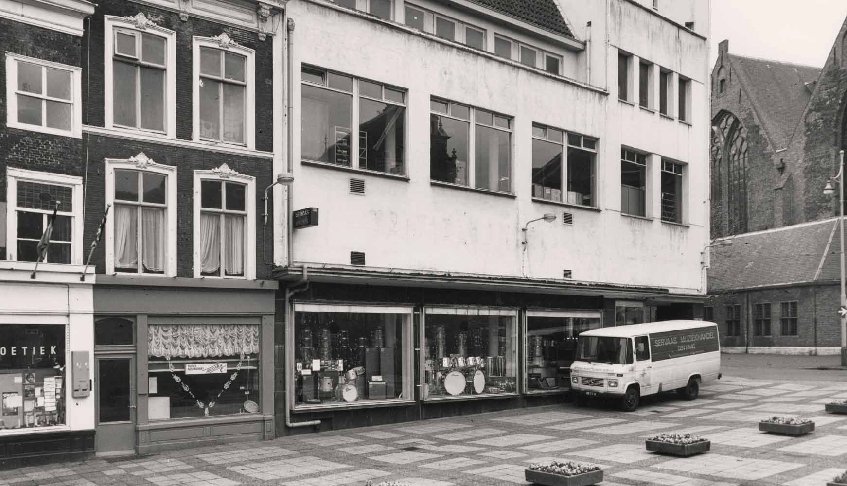 Schoolstraat 7 en zijgevel van Servaas Muziekhandel. Foto uit 1977, Dienst voor de Stadsontwikkeling, collectie HGA -