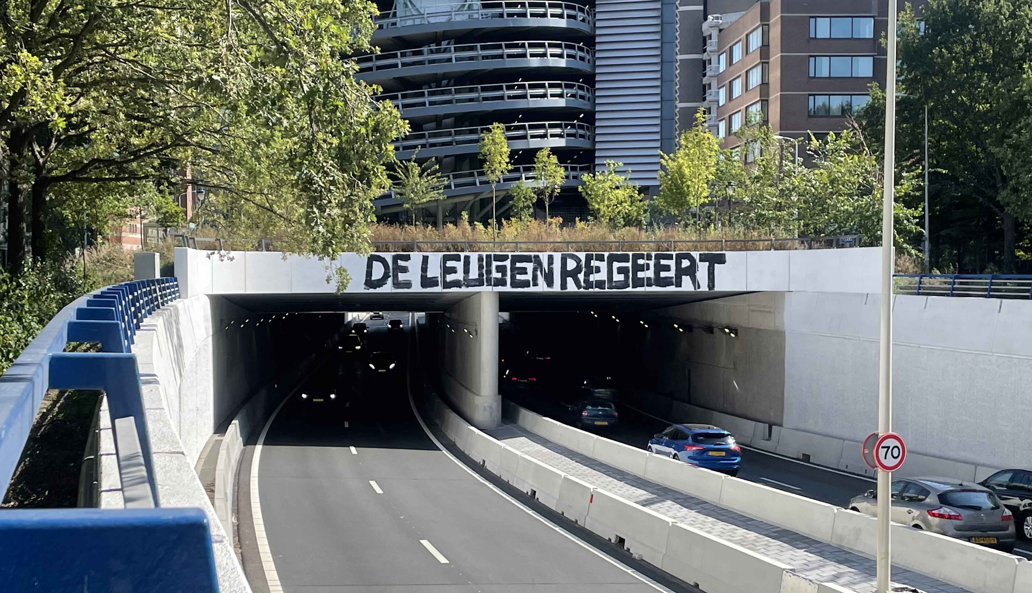 Het springt hard in het oog als ik de stad uitrijd via de Utrechtsebaan: de leugen regeert! staat er in grote zwarte kapitalen op de overkapping. Nog…