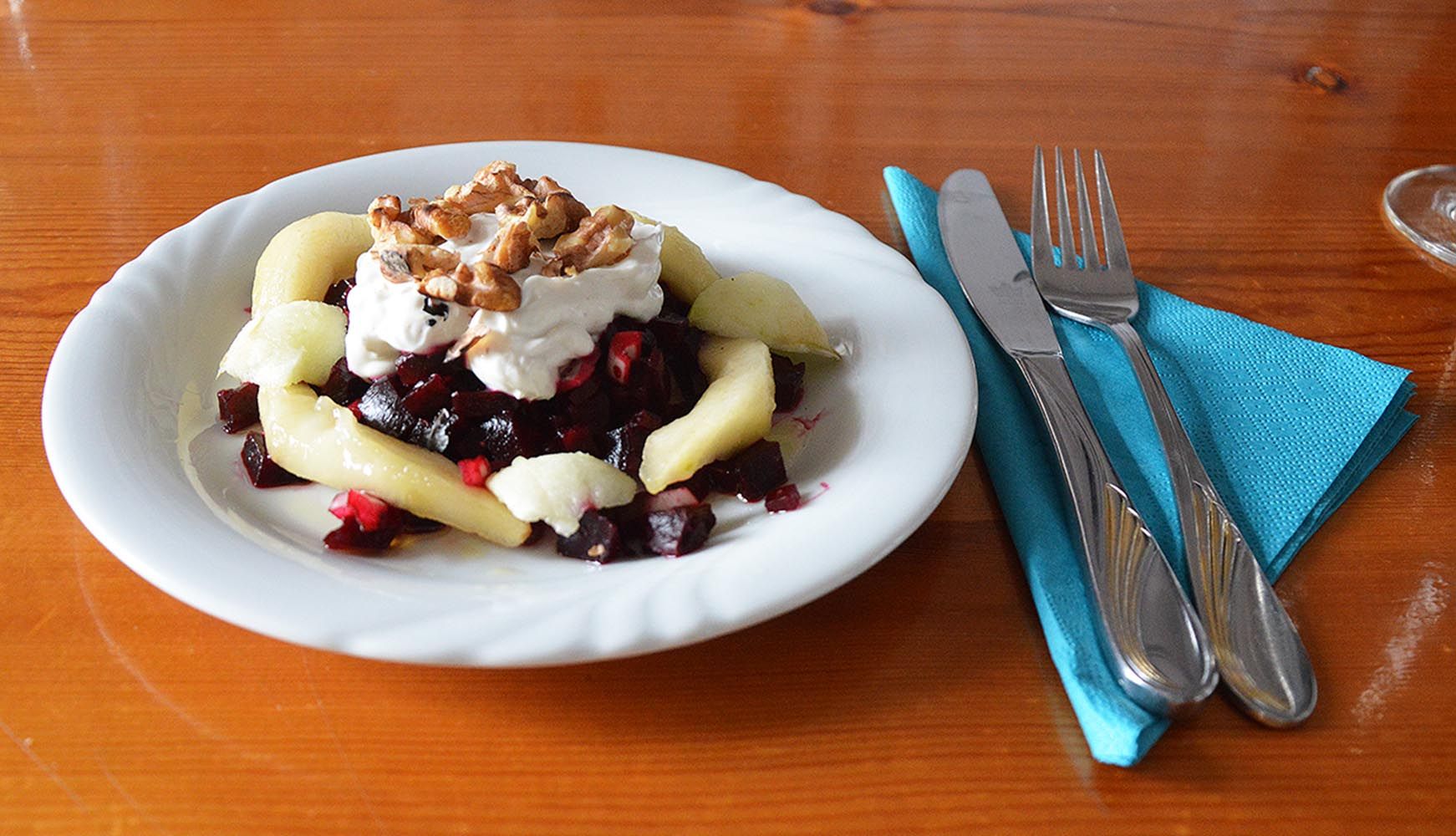 Nu kan je het gerecht op maken door de tartaar op een bord te dresseren met daarop de hangop, de appel-bolletjes en peer. Maak het geheel af met geroosterde walnoot en als vinaigrette gebruik je het bietenvocht met wat olijfolie. Je hebt nu een fantastisch vegetarisch bij- of voorgerecht. Eet smakelijk!