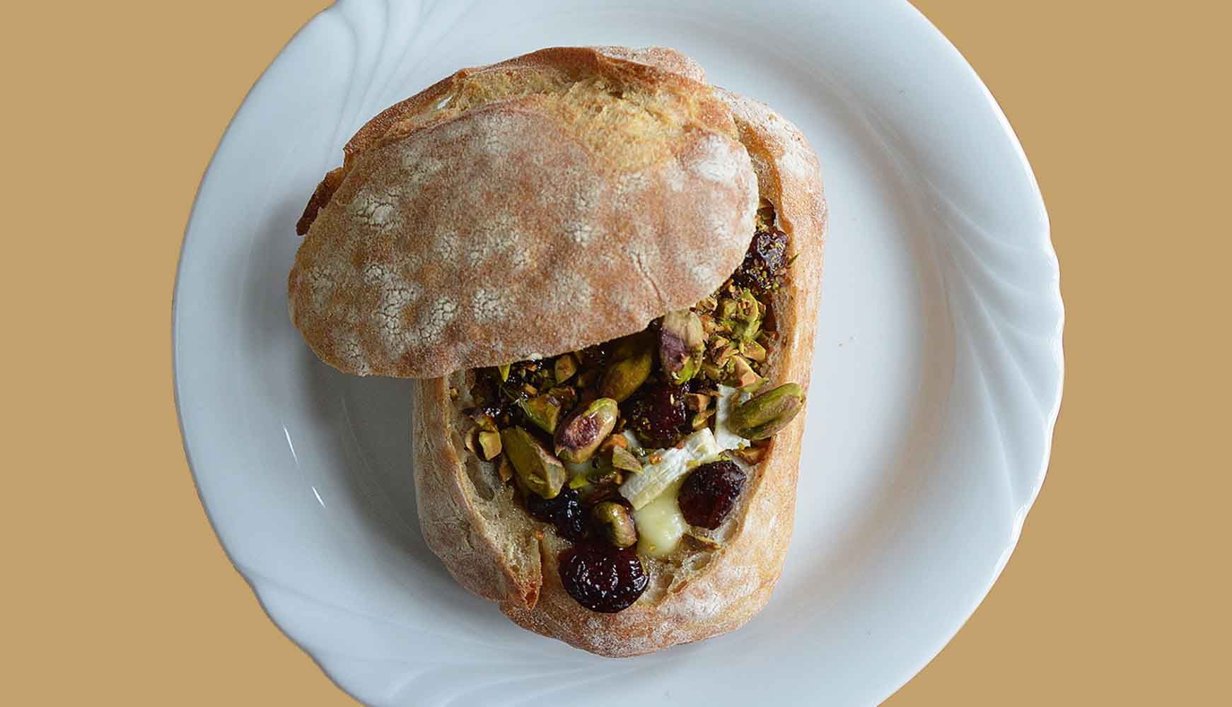 4. Doe de cranberry en pistache samen met de honing-tijmdressing bovenop de camembert.