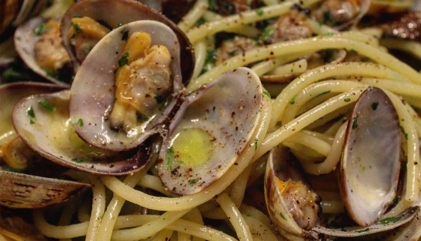 5. Na een paar minuten gaan de vongole openstaan. Voeg de peper toe en hussel weer een paar keer, schep de vongole uit de pan en hou apart.