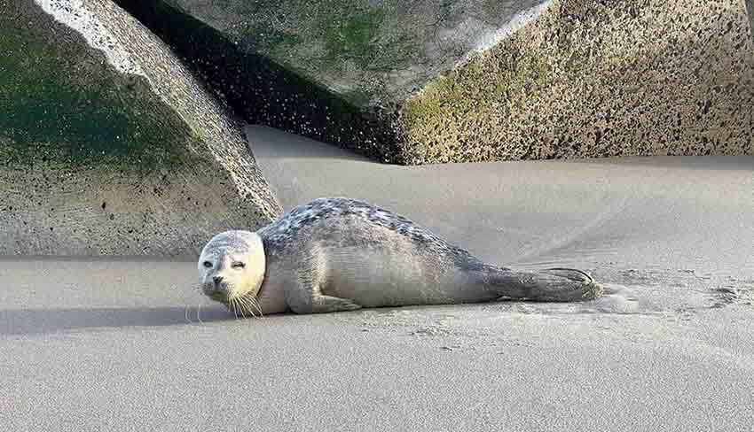 Binnen de twee havenhoofden bevinden zich drie kleine strandjes die afgescheiden zijn van de kustlijn. Eén tegen het noordelijk havenhoofd en twee tegen het zuidelijk havenhoofd. Deze strandjes worden met regelmaat gebruikt als rustplaats voor zeehonden. Ze zijn niet vaak te zien. Maar heel af en toe duikt er een zeehond op die met zijn kop boven water nieuwsgierig om zich heen kijkt. Het gaat dan altijd om de gewone- of grijze zeehond. Een tijd geleden zag ik op het strand bij de basaltblokken van het zuidelijk havenhoofd een zeehond van een aantal weken oud die waarschijnlijk in de steek was gelaten. Reddeloos keek het beestje angstig om zich heen. Het ingeschakelde Pieterburen Zeehondencentrum nam de jonge zeehond mee om het elders op een betere en veilige plek weer los te laten.