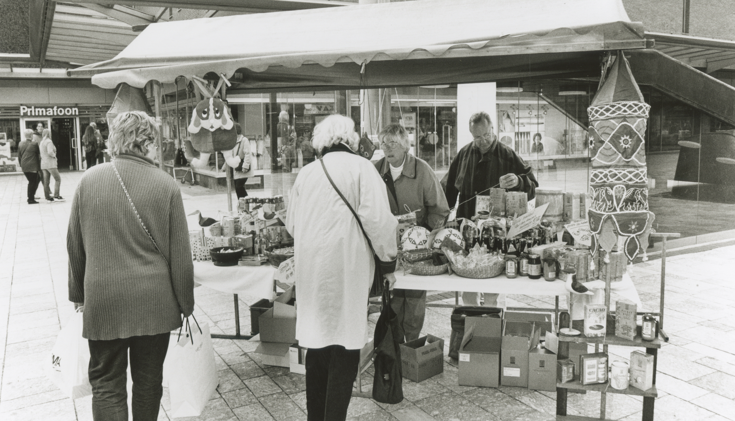 Kraam van de Wereldwinkel, in het winkelcentrum Leidsenhage, 2000. Foto: coll. Haags Gemeentearchief -