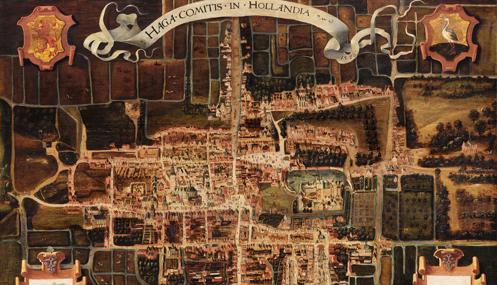 Reproductie naar geschilderde plattegrond ‘s-Gravenhage uit 1663, door Cornelis Elandts.. Weergave situatie omstreeks 1570. Collectie Haags Gemeentearchief. -