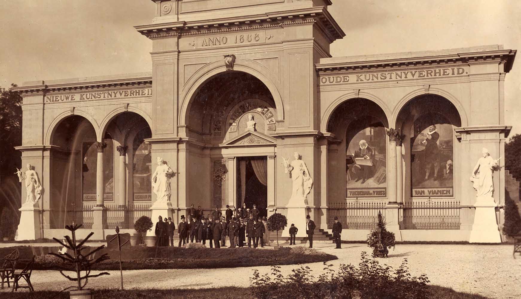 Ingangsgebouw van de Nationale tentoonstelling van Oude en Nieuwe Kunstnijverheid op het Malieveld, 1888. Foto: Henri de Louw, collectie Haags Gemeentearchief -