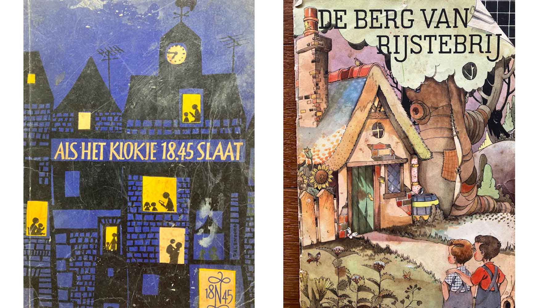 Maar er waren ook heel veel boekjes speciaal voor kinderen. De Nederlanden van 1845 kwam in die tijd met Als het klokje 18,45 slaat. Mooi gevonden want dat was het ‘voorlees-uurtje’ voordat je naar bed gaat, zoals de inleiding meldt. Er was veel werk van gemaakt. Niet de minsten schreven erin, de Nederlanden van 1845 wilde een hoog niveau! Bijdragen van onder andere Mies Bouhuys, Han G. Hoekstra, Jean Dulieu (van Paulus de Boskabouter). Vaak met illustraties van Jip en Janneke, waardoor Fiep Westendorp bekendheid kreeg. Grappig is dat er toen al een verhaal van een piepjonge Wieteke van Dort in stond. In de jaren zestig van de vorige eeuw kwam er een nieuwe uitgave, De Molen van 1845, ook weer met toen befaamde schrijvers en tekenaars! Om er wat te noemen: Tonke Dragt, Miep Diekmann, An Rutgers van der Loeff en Paul Biegel. Illustraties van onder andere Otto Dicke, Peter Vos en Jaap Vegter. Van de dichter Hans Andreus is nog het boek Een bos vol dieren.
