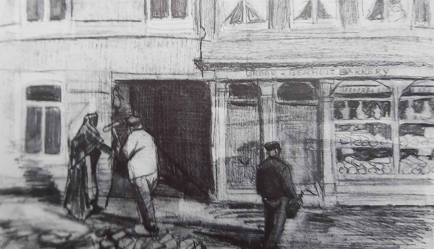 In het eerdergenoemde boek Van Gogh en Den Haag staan op pagina 48 en 49 enkele door Vincent van Gogh gemaakte tekeningen. Deze tekeningen zijn in de maand maart van het jaar 1882 gemaakt. Lange tijd is gedacht dat de afgebeelde bakkerij zich in de Geest bevond en dan bedoel ik de straat met die naam. Vincent ging in die tijd vaak met zijn schetsboek naar het Kortenbos, een volkswijkje vol stegen en hofjes. Soms deed hij dat samen met de kunstenaar George Breitner die in de buurt in de Juffrouw Idastraat op nummer 16 een atelier had. Zoals u misschien wel weet, zijn er heel veel brieven van Vincent van Gogh bewaard gebleven. In een van die brieven schrijft hij over een van die tekeningen: “Dat is gemaakt op de Geest in de stofregen in een straat waar ik in ’t slijk stond”. Het lag dan ook voor de hand om te denken dat het hier om de straat Geest gaat. Nader onderzoek wees uit dat er twee bakkerijen in die straat waren en er wordt zelfs aan getwijfeld of een van die twee bakkerijen er op dat moment al was. Het opschrift ‘brood- en beschuitbakkerij’ zoals op bovenstaande tekening staat was bij beide bakkerijen niet van toepassing. Vincent schrijft in zijn brief op de Geest en daarmee geeft hij aan dat hij die tekening in het buurtje de Geest gemaakt heeft. Na enig zoeken werd duidelijk dat het hier om een bakkerij in de Noordstraat op nummer 13 en 15 gaat. Gezien het perspectief van die tekening moet hij gemaakt zijn vanuit de eerste verdieping van een huis dat schuin tegenover de bakkerij stond. Zowel de eerdergenoemde Sien als haar moeder hebben in die tijd op het adres Noordstraat 16 gewoond. Deze tekening of een schets ervan is dus van daaruit door Vincent gemaakt.
