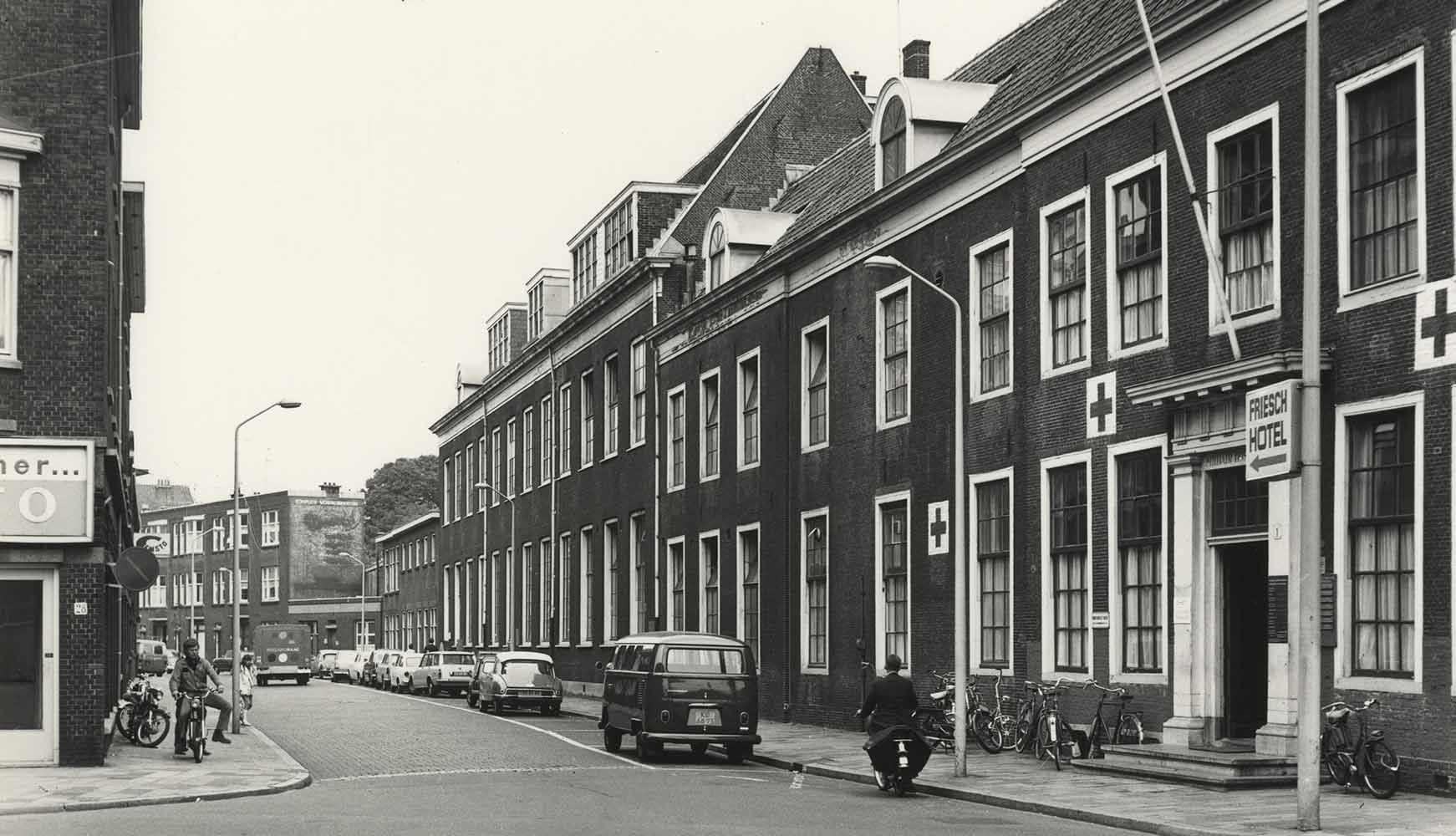 Muzenstraat, gezien vanaf de Fluwelen Burgwal, rechts het Militair Hospitaal. Foto uit 1970, Haags Gemeentearchief -