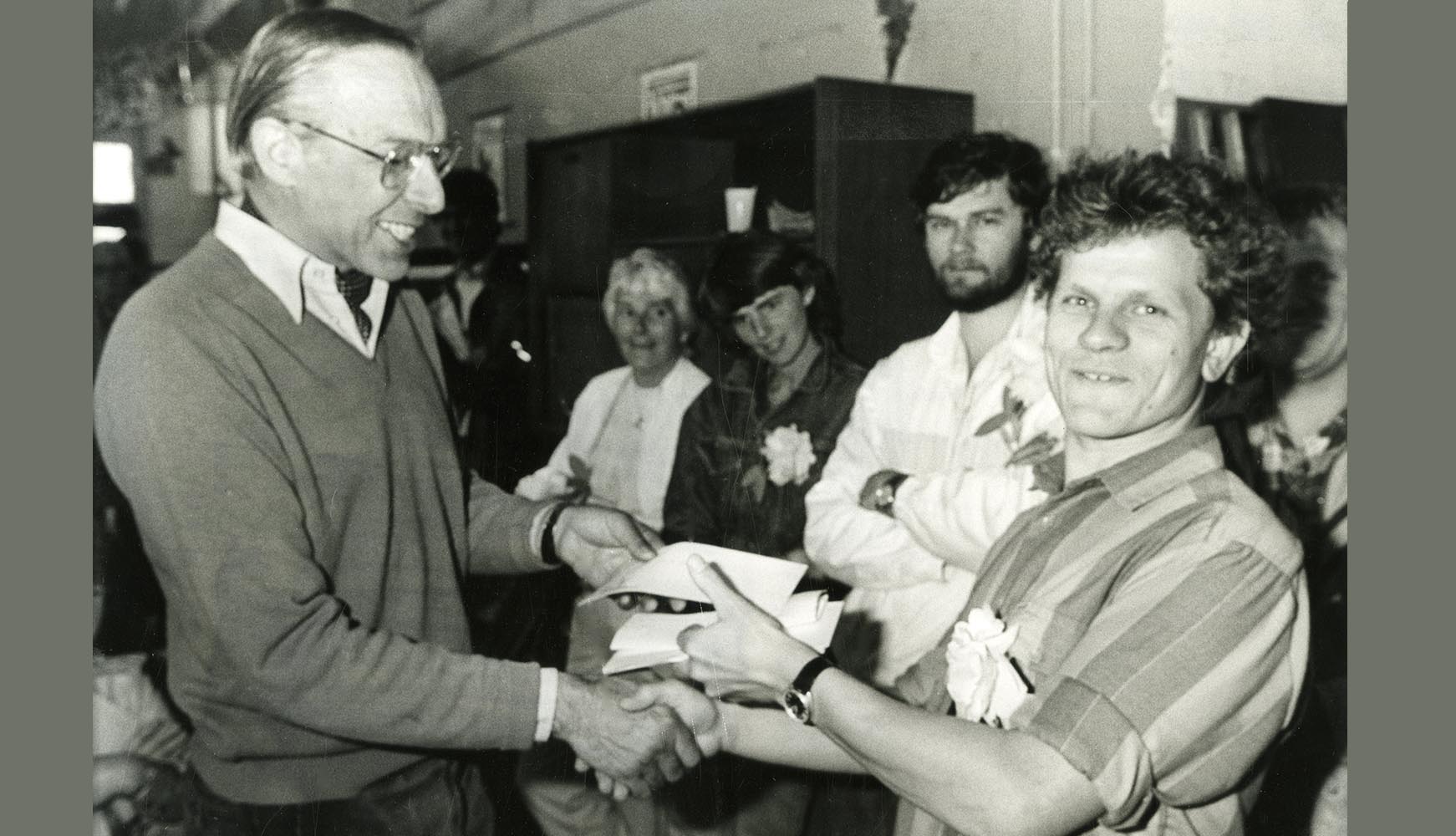 Kees Schmitz overhandigt een cheque aan W.C.J. van Houten (Terre des Hommes) tijdens de viering van het 12-jarig bestaan van De Habbekrats in het pand aan de Hooftskade. Foto uit 1985, Cees Verkerk, Haags Gemeentearchief -