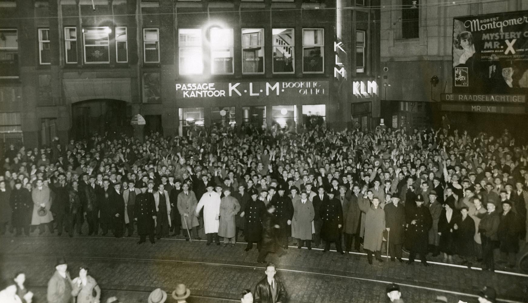 Belangstelling voor de Uiver, in de Londen-Melbourne race, bij de KLM aan de Hofweg. Foto uit 1934, Gompers, Haags Gemeentearchief -