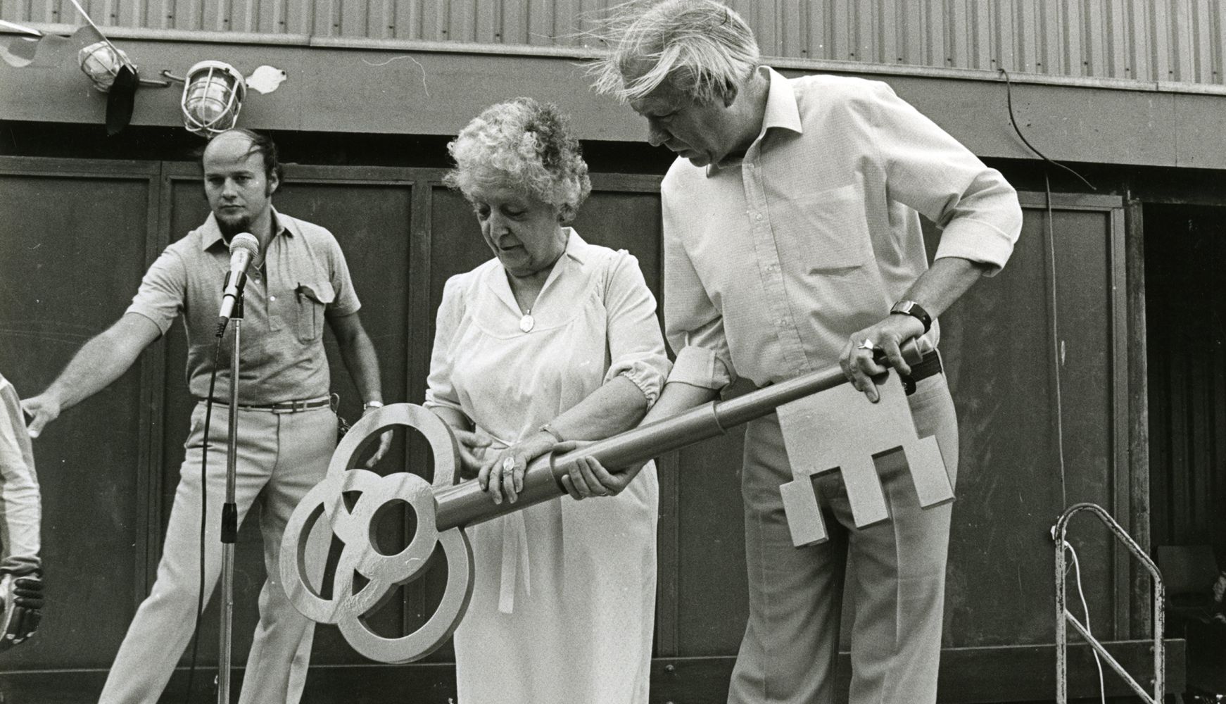Wethouder Piet Vink opent met een grote sleutel de derde sporthal van De Houtzagerij. Foto: Robert Schreers, collectie Haags Gemeentearchief -