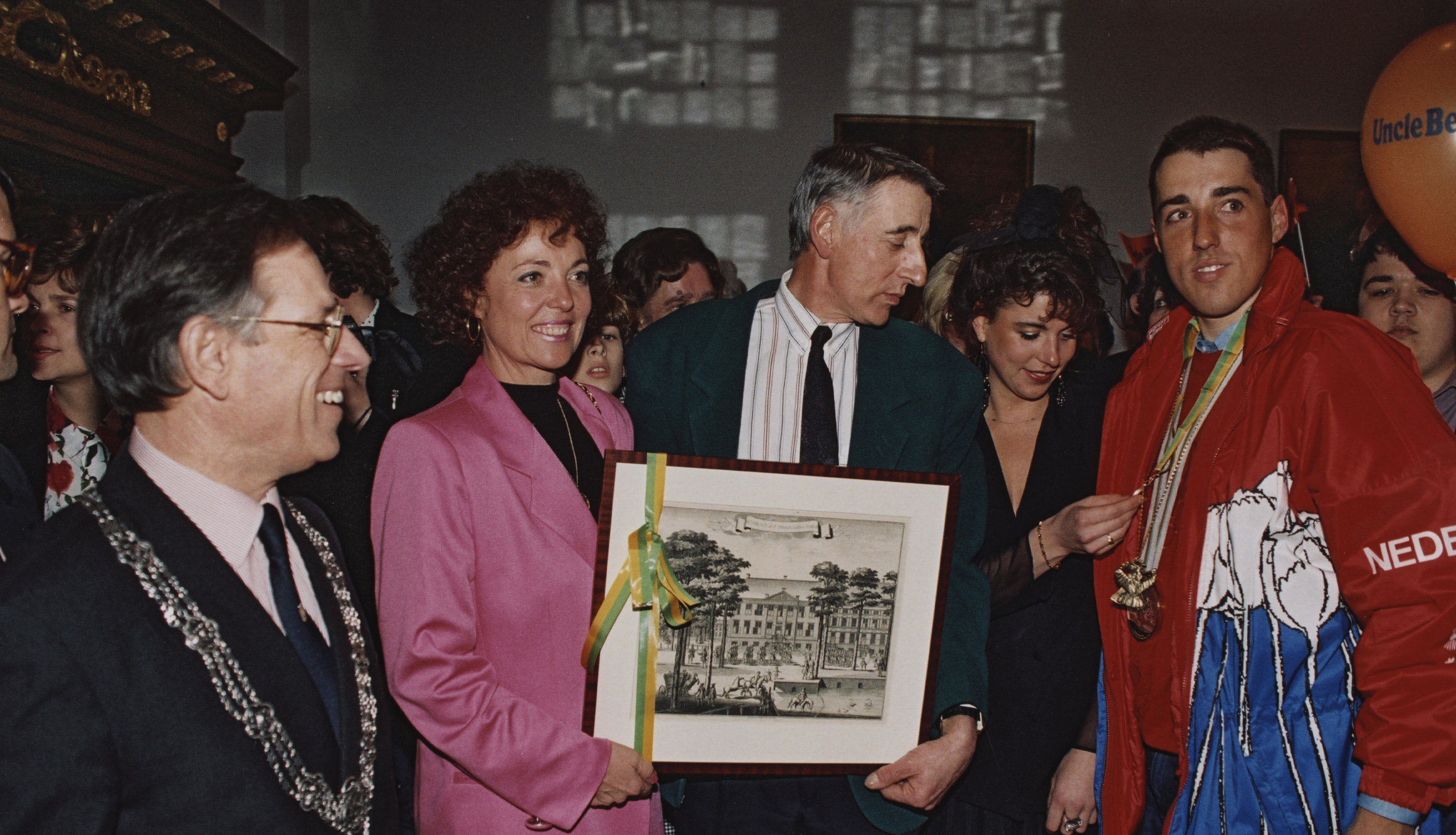 Huldiging van schaatser Bart Veldkamp op het oude stadhuis aan de Groenmarkt, vanwege zijn gouden medaille tijdens de Olympische Winterspelen in Canada, 1992. Foto: Thuring, collectie Haags Gemeentearchief -