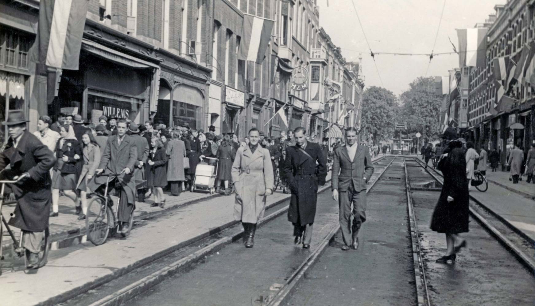 Geteerde houtblokjes zijn uit de tramrails van de Zoutmanstraat verdwenen tijdens de hongerwinter. Foto uit 1945, M. Huizinga, collectie HGA -