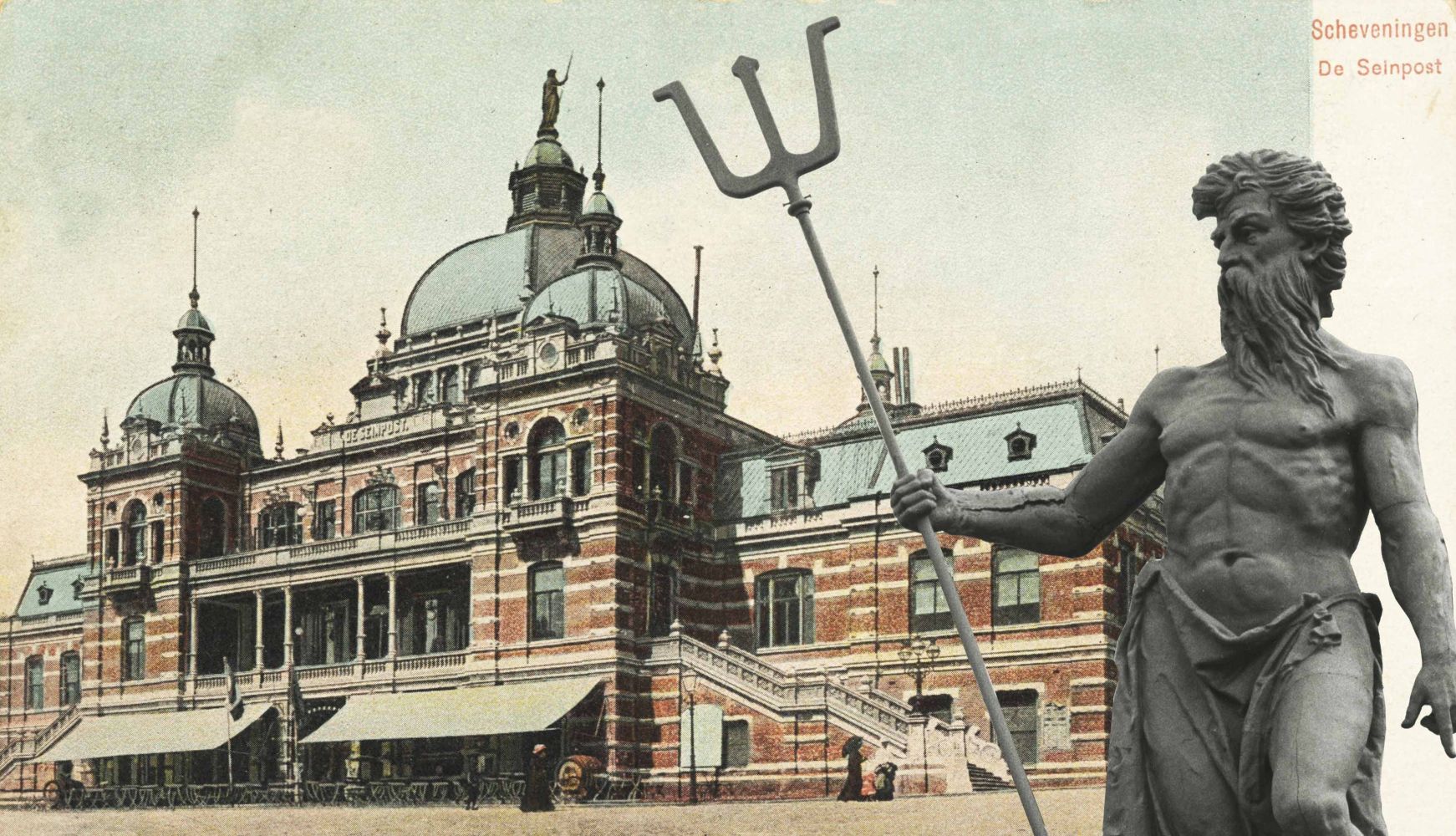Hoofdingang van het Seinpost theater en restaurant, ‘Hotel des Ambassadeurs’ met het Neptunus-beeld, 1910. Foto: collectie Haags Gemeentearchief -