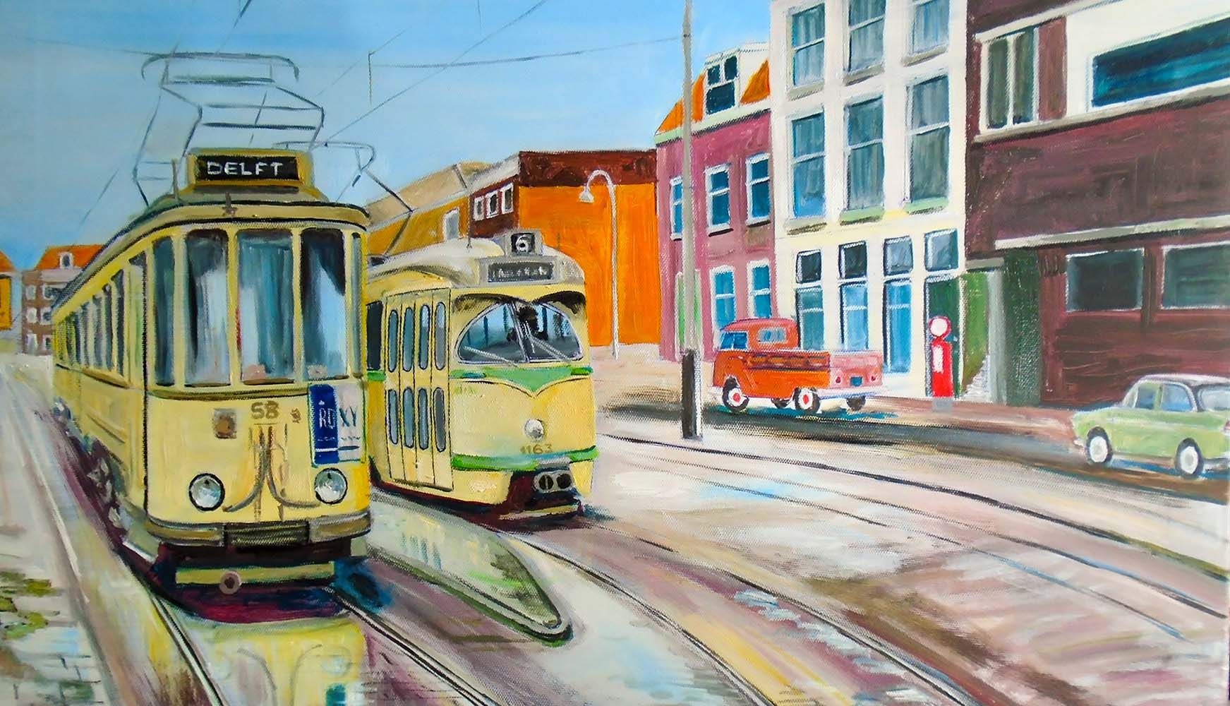 Buitenlijner 58 naast PCC 1163 staat klaar voor de rit naar Delft, Turfmarkt. Schilderij: Jim Gijbels -