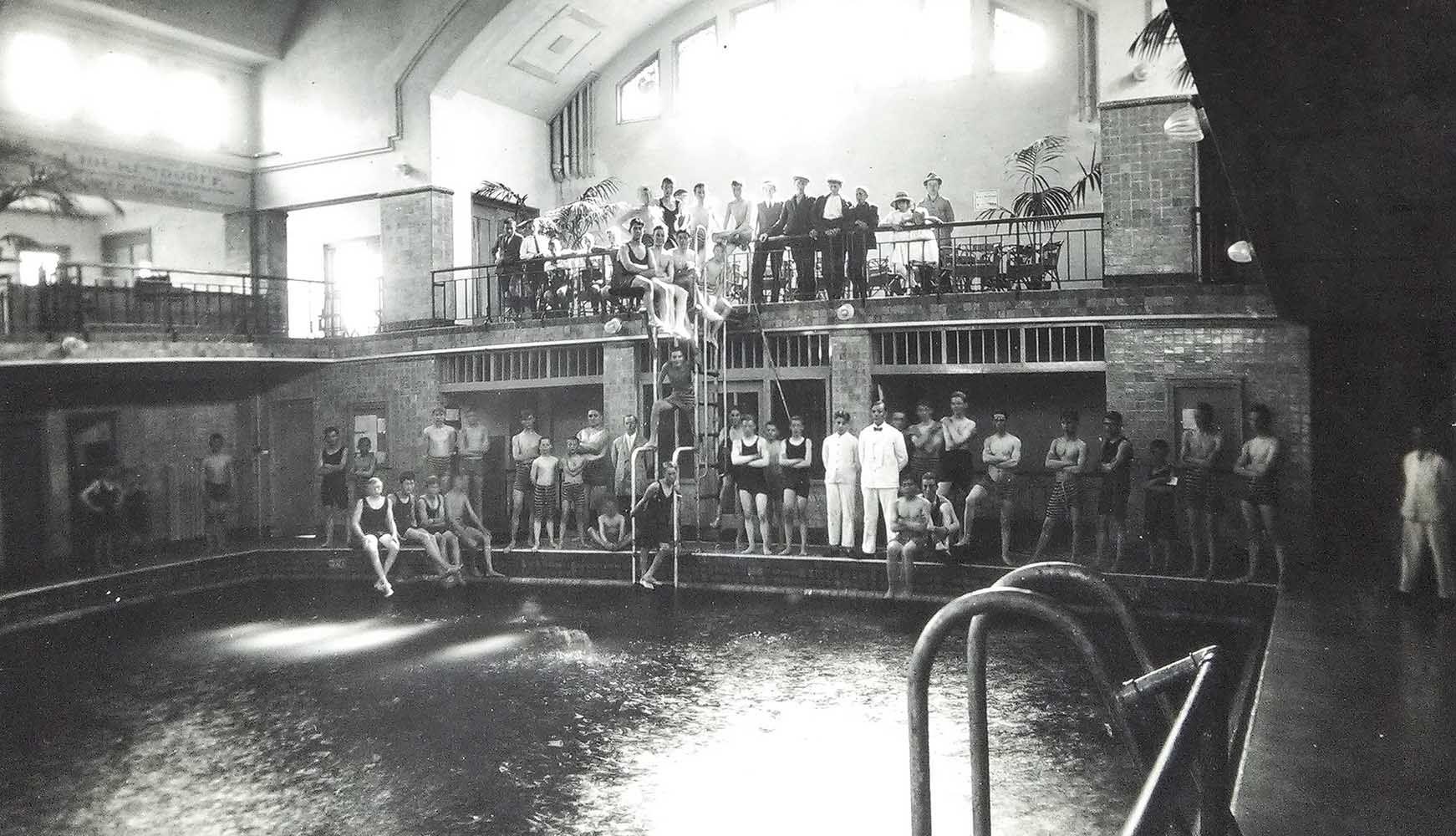 De zwemhal in 1921 toen gemengd zwemmen alleen nog maar op speciale tijden mogelijk was. De chique heren in het wit met vlinderdas zijn de badmeesters. Foto: collectie Haags Gemeentearchief -