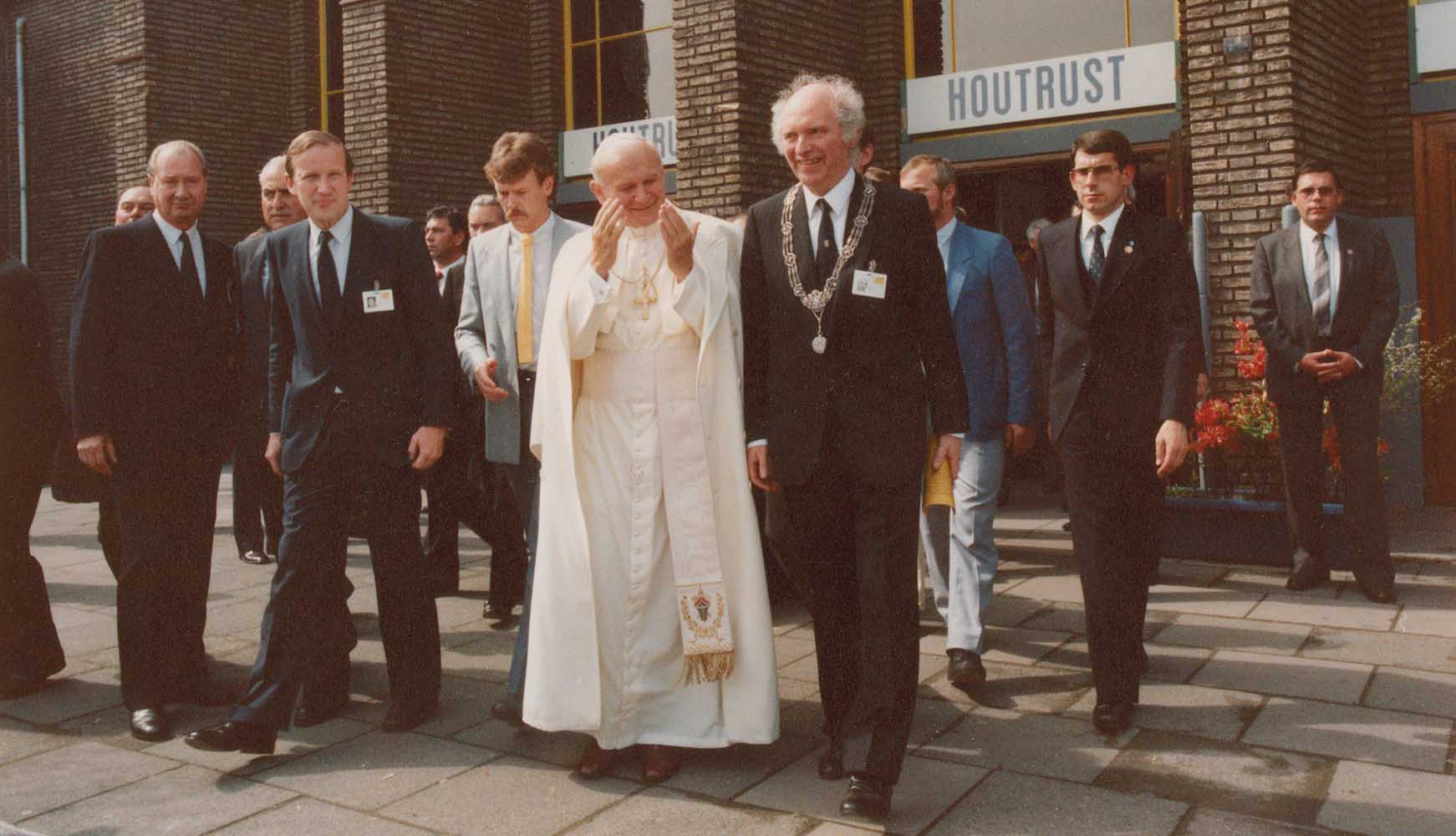 Paus Johannes Paulus II verlaat Houtrust na de Eucharistieviering voor zieken en beperkten. Links van de Paus de Commissaris van de Koningin, dr. Schelto Patijn, en rechts Burgemeester drs. F.G.L.L. Schols. Foto: Fotoburo Thuring, Haags Gemeentearchief -